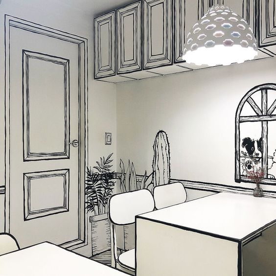 Това е съчетанието на класическите епохи, чиито интериори ни служат за пример и до днес. Пресичането на линии под произволен ъгъл обаче вдъхва неспокойствие и колебливост, а когато този ъгъл е остър, той действува неприятно. При увеличаване на разнопосочно пресичащите се линии чувството за неспокойствие се усилва и води до впечатление за обърканост и хаотичност. Правите линии могат и да лъжат коригиращите възможни варианти на окото и да създават невярни възприятия за предметите и околната среда. Това илюзорно въздействие се използува за подобряване на естетическите качества на пространството, но може да доведе и до обратни резултати. Например при покриване с надлъжно раирана подова настилка помещенията оптически се издължават, а при напречно райе се скъсяват. Но късите успоредни линии създават обратни ефекти. Ако една малка квадратна плоскост се насити с хоризонтални успоредни линии, тя изглежда значително по-широка, отколкото дълга. Карираните, раираните и щрихираните петна изглеждат по-дребни от равностойните им празни петна. Това е широкоизвестната илюзия на разпространението, вследствие на която тъмните петна изглеждат по-го-леми. Затова и щрихирането може да се използува винаги при желание за изменяне на впечатлението от по-малки плоскости или ленти.