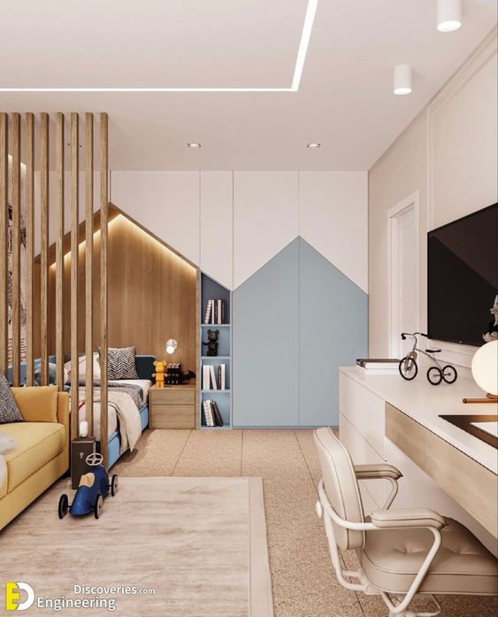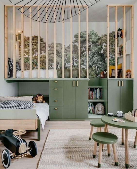 В детската стая за да може да се осигури повече свободно място, когато децата са две целесъобразно е за спане да се използуват легла едно над друго, които заемат по-малка площ. Както възрастните, така и децата имат нужда от своя отделна стая, където всичко е подредено съобразно техния свят. Тогава по-голямото дете достига горното легло посредством стълбичка. Леглата могат да бъдат и едно под друго. В този случай долното легло е на колелца и се издърпва само през нощта, а през деня е под горното и освобождава място за игра. Когато едно от децата е още бебе, долното креватче представлява кошарка. Тъй като в тук се оформя новият подрастващ човек,детската стая трябва да бъде подредена целесъобразно, изискано, с вкус.
