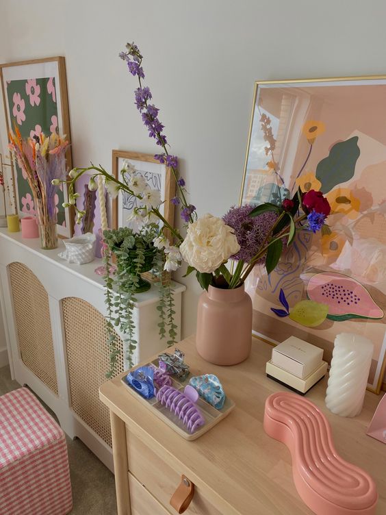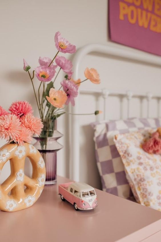 Дали ще се спрете на пъстри или едноцветни пердета зависи много от завивките и постелките. Ако те са многоцветни (черги, килими с фигурни композиции), трябва да се спрете на едноцветни пердета. И обратно. Много трудно се постига желана хармония, когато и пердетата, и постелките са пъстри. Добра комбинация е, когато за перде се подбере цвят от покривката на леглото или постелката на пода. Понякога само поради несполучливо избрани цветове детската стая е неуют-на, потискаща. Не е правилно да се стремите към голям килим, ако подът има хубав паркет или мокет в приятен, хармониращ с обстановката цвят. Малко килимче, халище или пътека в хубави цветове, постлани под работната маса или пред леглото, придават изящество на стаята. Не се увличайте по много цветя в саксии, във вази. Едно декоративно растение от рода на фикуса е достатъчно. Само че обърнете внимание на самата саксия. Тя не трябва да се натрапва с формата си или да бъде обвита в станиол. Вазите също не бива да са „подобрени“ с допълнителни украшателски елементи – нарисувани цветя, пейзажи, златни ивици. Една ниска вазичка от стъкло или керамика със семпла форма и в хармоничен цвят с обстановката подхожда много за стая, в която живее ученикът или студентката.Свежите цветя говорят за добър вкус и придават настроение.