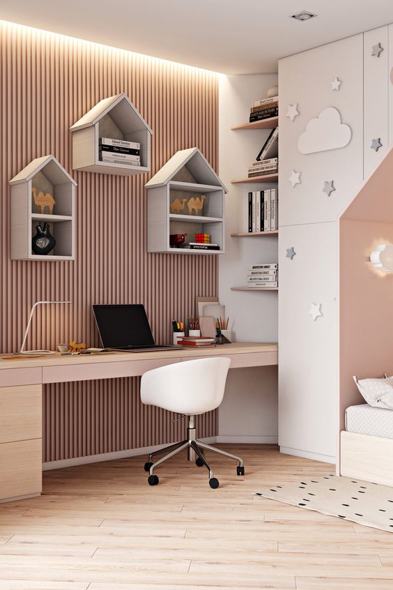 на двама ученика и е по-евтино в сравнение с бюрото и писалищната маса. Когато се разполага с повече средства, пак под прозореца може да се организира работно място с повече удобства. С малко средства стаята на малките по-късно може да се превърне в стая за гимназисти и студенти. Тогава трябва да се поставят допълнително още етажерки и шкафчета, които да побират повече книги. Писалището може да бъде вградено и в библиотеката. За спане са удобни легла с ниски, прави табли. Малко нощно шкафче с чекмедженца би служило да се поставят на него най-необходимите книги за четене, настолна лампа, радио. Шкафчето може да бъде свързано с широка дъска, която опасва околовръст цялото легло, или с ефектна рогозка. При ограничено място може да използуваме легло-шкаф, който се прибира към стената и се закрива от предната страна с врата или завеса. За предпочитане е гардеробът в детската стая да е с опростена линия отвън, с гладки прави врати и богато вътрешно разпределение, съоръжен с лост за закачване на дълги и къси дрехи, с рафтове и чекмеджета за бельо, чорапи и други неща. Ако гардероба е с надстройка или има възможност да се постави по цялата стена или част от нея, това би улеснило прибирането на различните дрехи и завивки през сезоните, когато те не се използуват. За детската стая се препоръчват мебели със светли цветове – дъб, бряст, ясен, явор, избелен бук. В една стая винаги се чувствува нужда от стол. Не само до работната маса, но и за гости, за четене, слушане на музика, почивка. Лампион, поставен на пода, или аплик на стената с абажур в жълто, червено или най-добре в бяло осигурява необходимото осветление и създава уютност и приятна атмосфера. Неумелото използуване на цветовете може да унищожи цялата красота на обзавеждането. Затова цветовете на стената и другите вещи трябва да се свързват хармонично.За светла, слънчева стая винаги трябва да предпочитаме пердета и завеси в студени цветове – в синьо, зелено, а там, където слънчевата светлина прониква оскъдно – по-топли цветове – жълто, кремаво, розово.