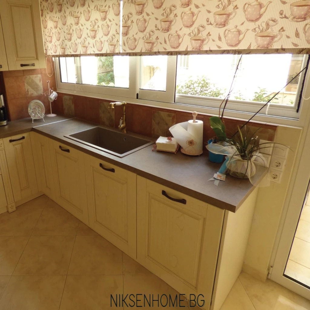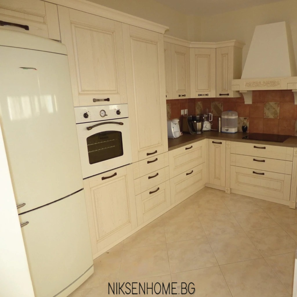 Типичните орнаменти, изпълващи ретро стила, са силно изразени. Масивни таблени вратички боядисани в слонова кост, плочки за гръб, винтидж аспиратор, центриран в композицията и пищен корниз. Термо плота в по-тъмен тон задава линия и контрастите, за да представи останалата част от кухнята подобаващо. Не на последно място декоративните фризове допълват пейзажа и ви пренасят на едно красиво пътешествие.