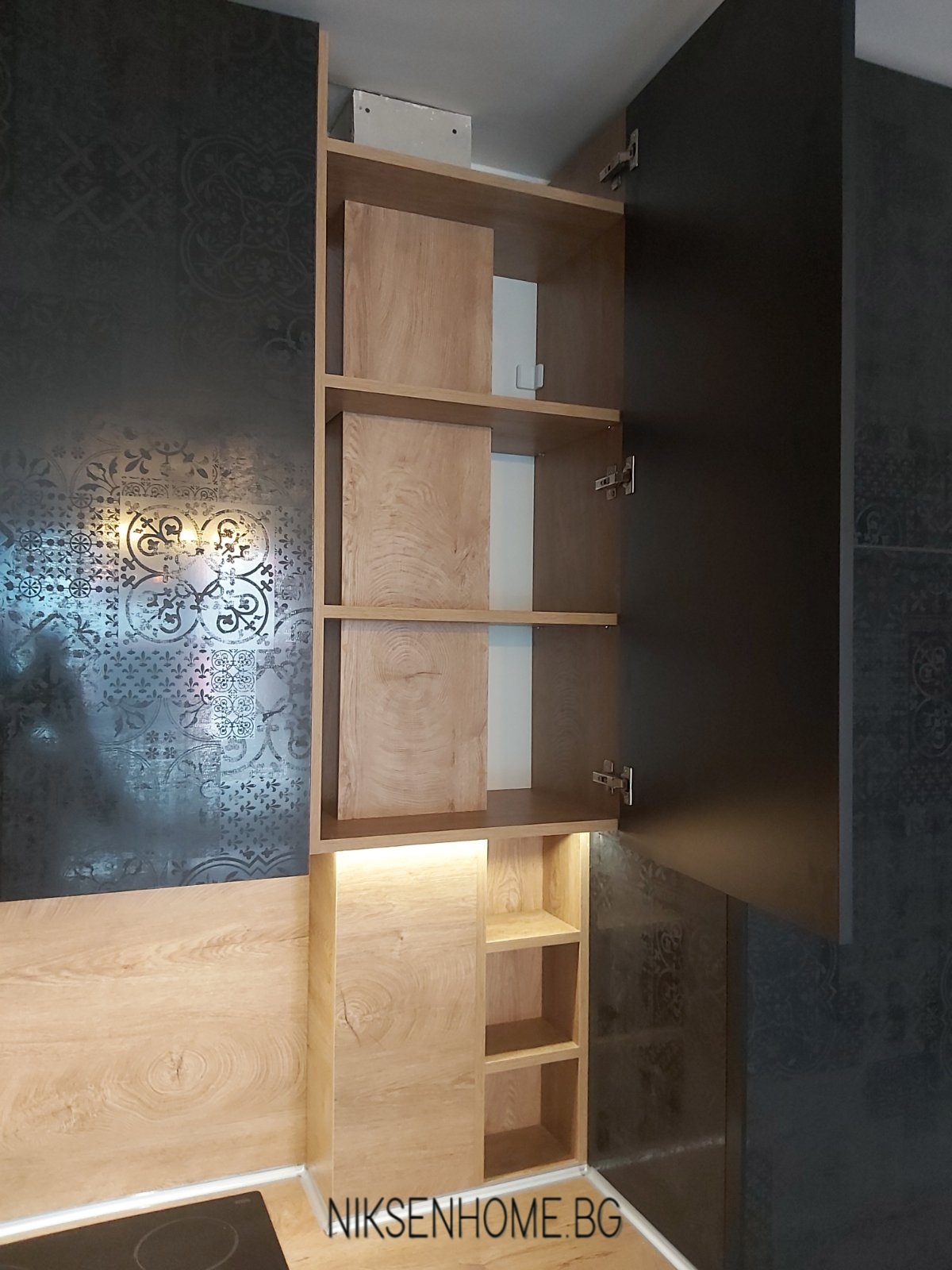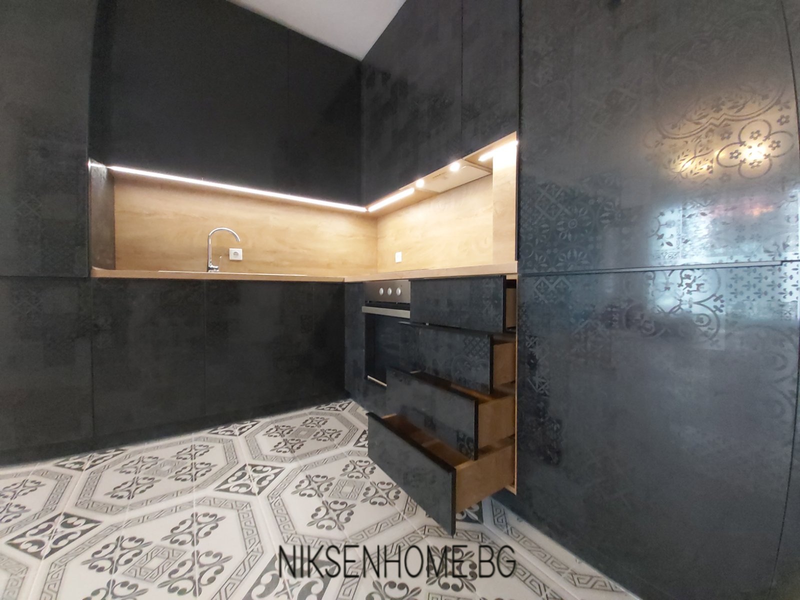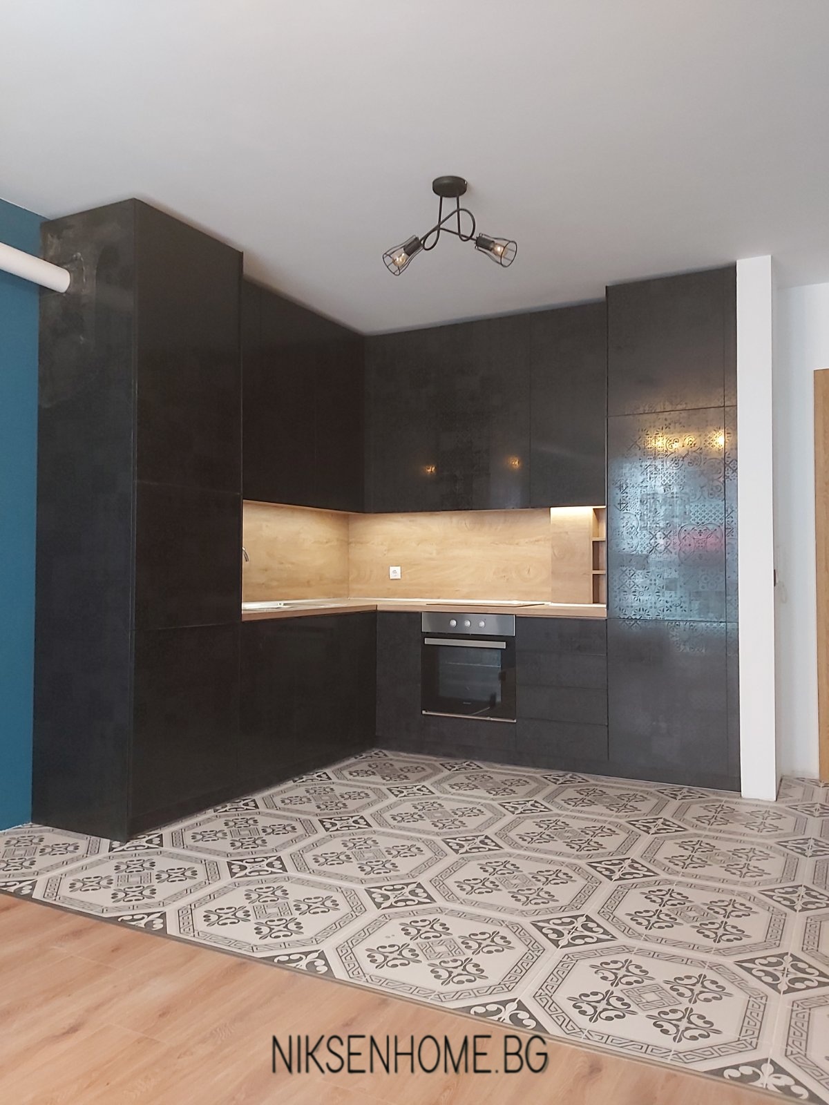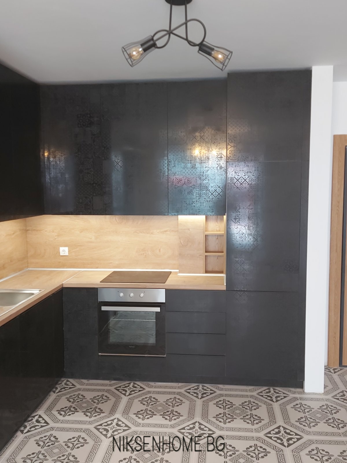 Кухня Блек Тайлс е част от общо помещение, което съвместява кухня, трапезария и дневна част. Клиентите дойдоха с идеята за тъмна кухня в комбинация с дървесен декор. Като при всеки проект и тук имаше предизвикателста, като газовото котле, което трябваше да приобщим към кухнята, също и да вградим всички електроуреди. Цялостната идея е кухнята да не се натрапва, но и да има индивидуално излъчване. За целта избрахме МДФ врати с полиестерно покритие с матова основа, а плота и гърба в дървесен декор, умело съчетан с настилката в дневната част. Визията без дръжки допълва желанието, орнаментите по вратите, да създават духа не само на кухнята, но и в целият интериор.