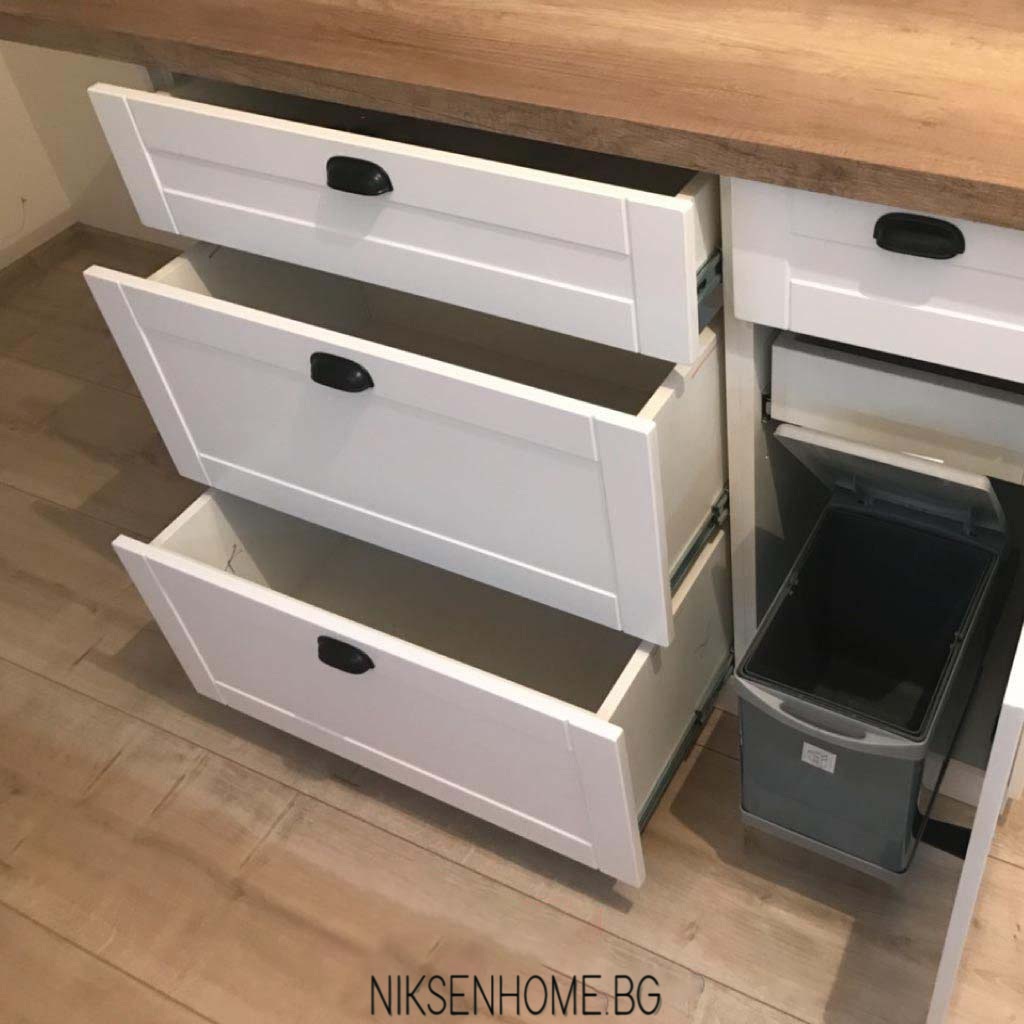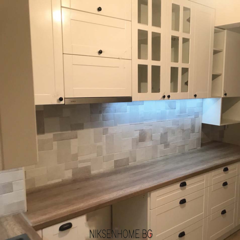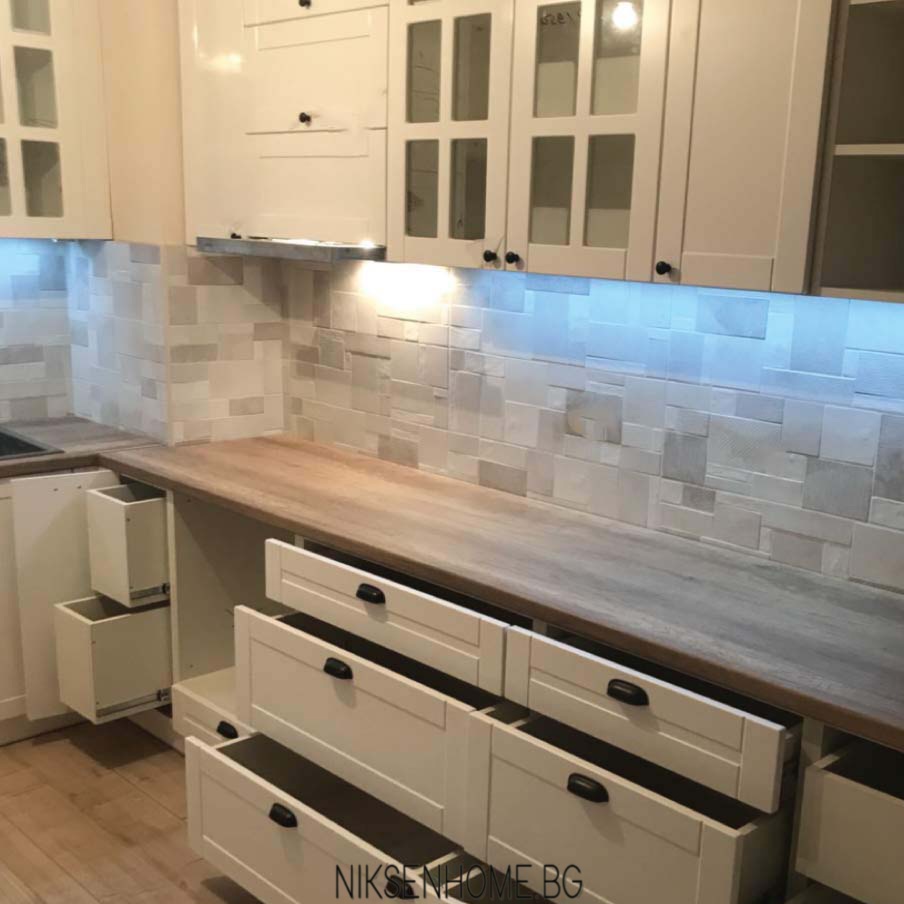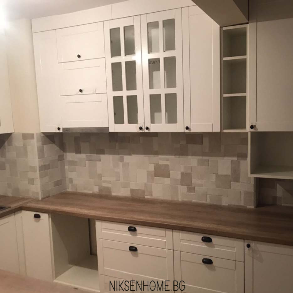 Представяме Ви още едно класическо изпълнение на Ретро кухня в бял цвят изработена от МДФ , с по-изчистена квадратна фрезовка, която не натежава на визията, която сме изградили. За плот клиентите ни предпочетоха термоплот в топъл дървесен мотив, който да контрастира на гърба и вратичките. За да разчупим визията на гореният ред са разположени няколко витрини и полици, както и няколко шкафа с вертикално отваряне. Оставяме Ви да се насладите на това бижу!