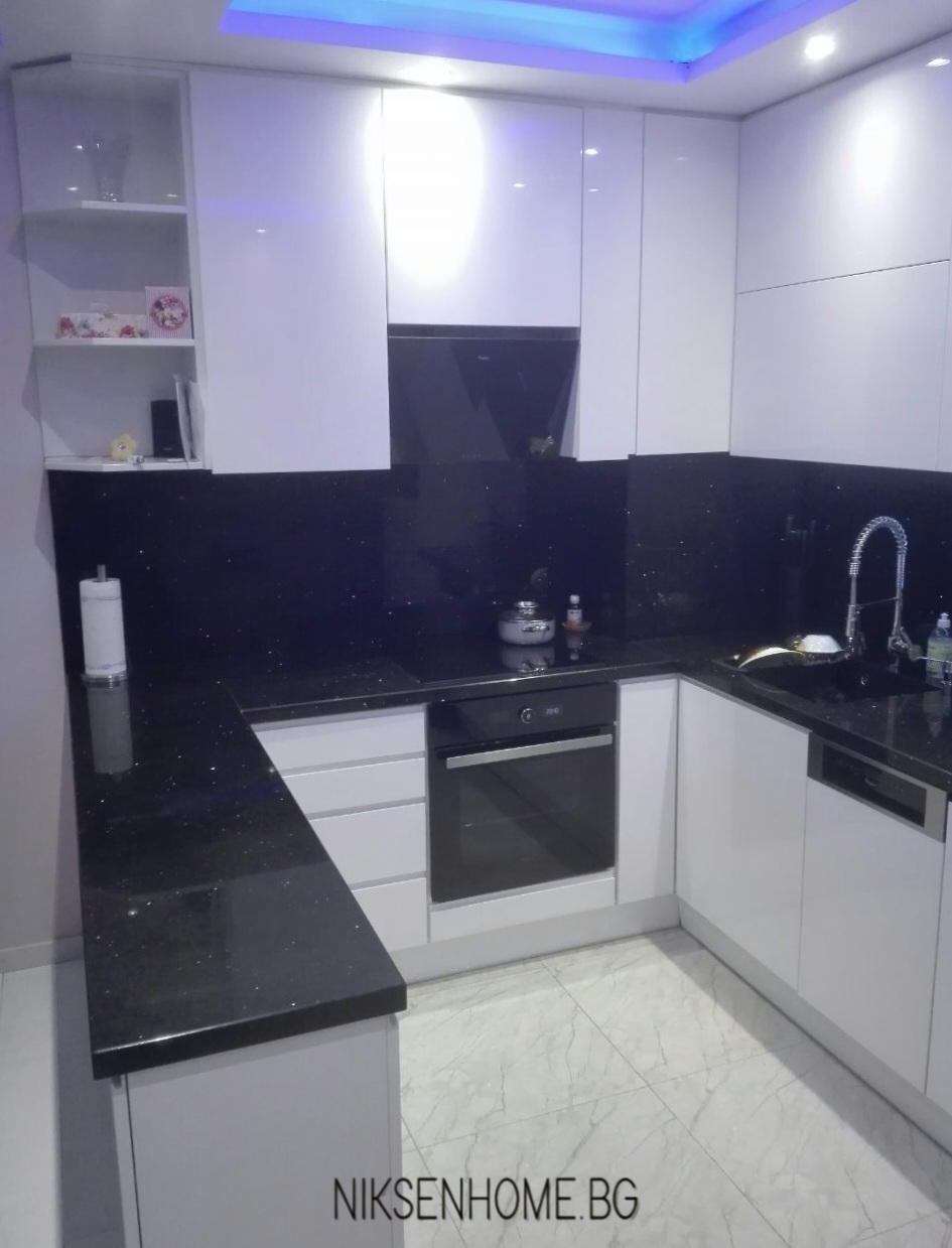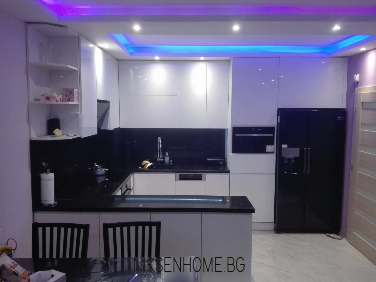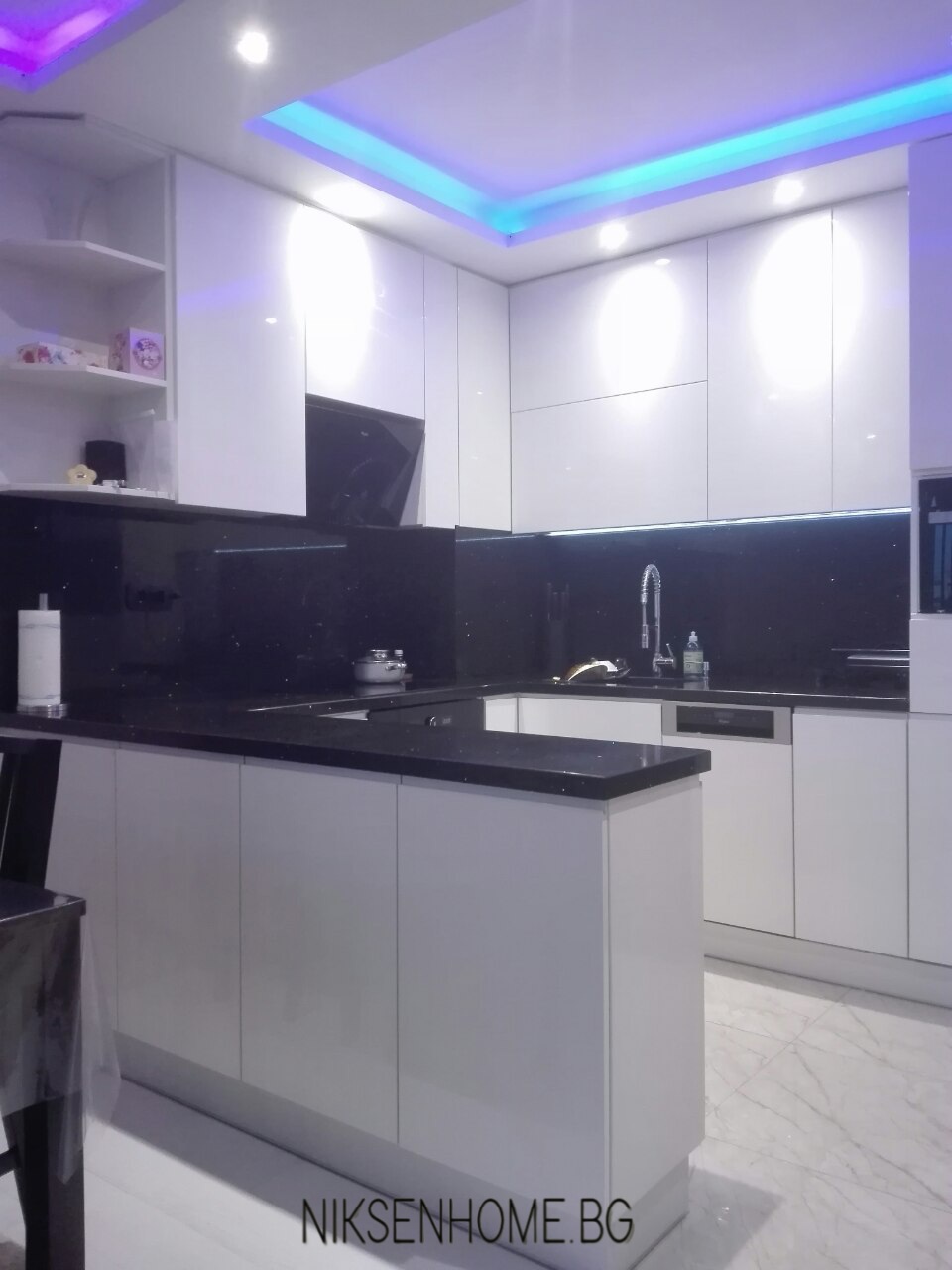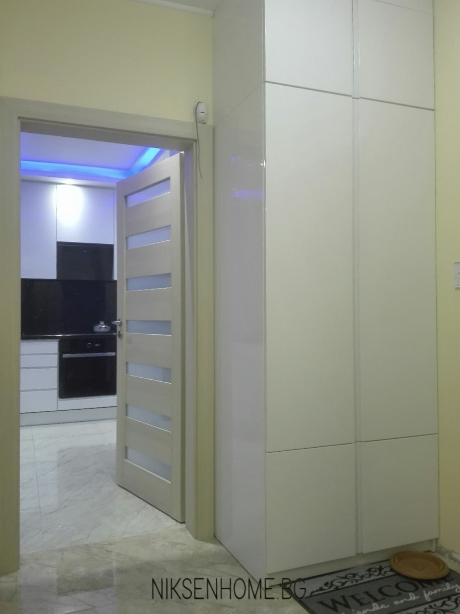 Представяме Ви още един успешно реализиран проект на цялостно обзавеждане. Главният герой в интериора на апартамента е белият цвят, който присъства във всяко едно помещение. В кухненската част намираме вечната класика от бяло и черно. Вратичките са изработени от МДФ боя с вкопани дръжки, които са доста търсени и предпочитани при модерните кухни. За плот и гръб е избран технически камък в черен цвят с огледални частици, който се допълва от електроуреди, които са подбрани в черно. В антрето всички мебели са изработени от бял МДФ боя отново с вкопани дръжки, които повтарят вратичките на кухненското и създават усещането за едно цяло с останалата мебелировка в дома. В детската стая са избрани пастелни цветове в зелено и розово, които да подчертаят бялото и свежо настроение на помещението. Мебелировката в детската е разположена максимално близо до стените, за да има достатъчно място за игра на малчуганите. Всички мебели са специално изработени спрямо нуждите на семейството, за да получават своят мечтан и уютен дом!