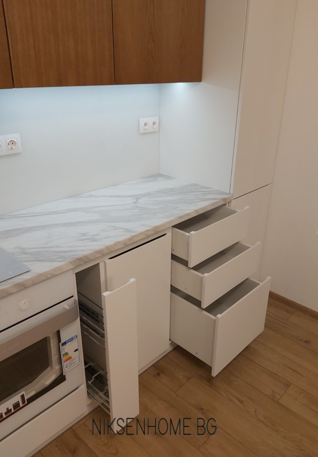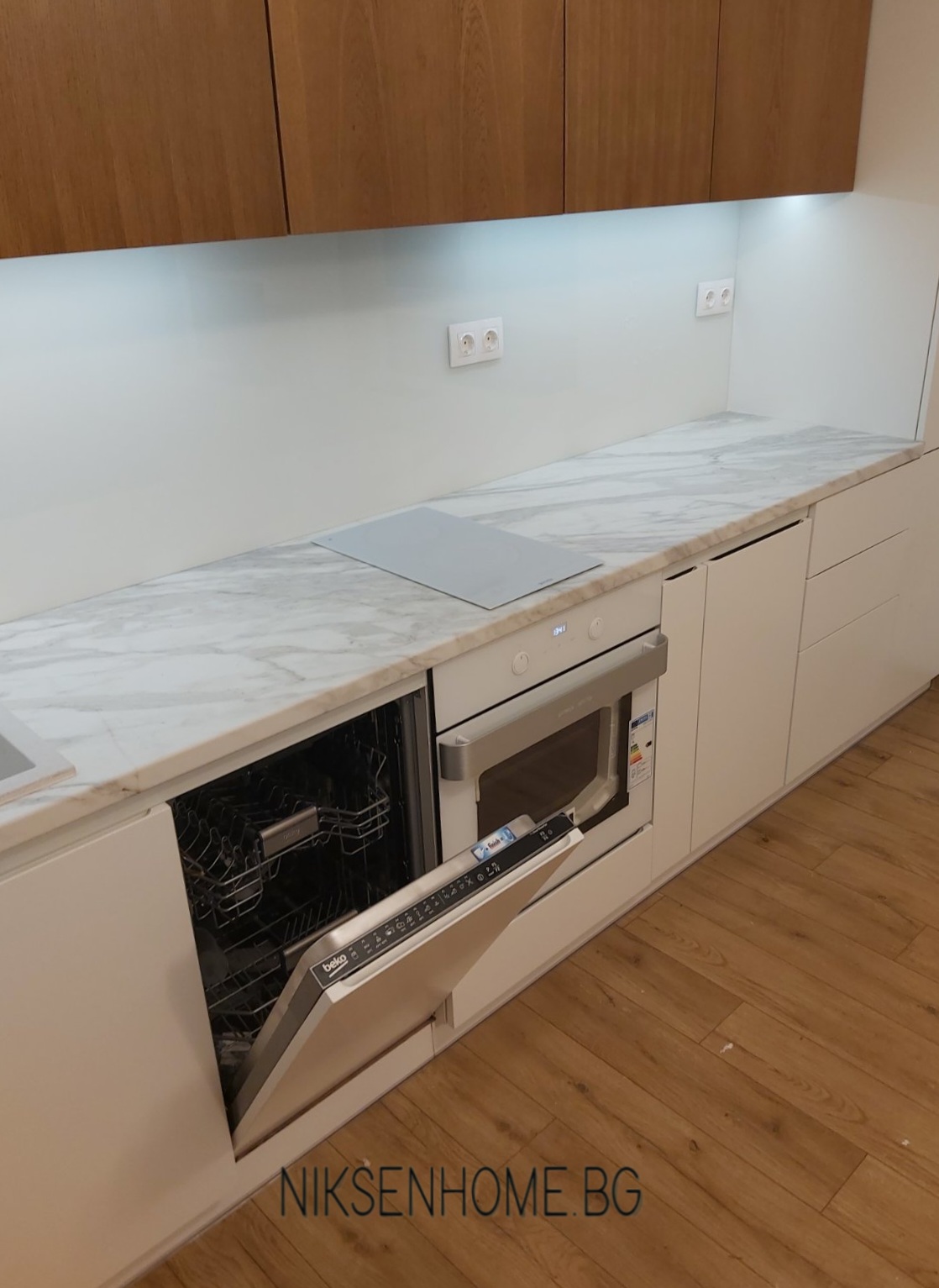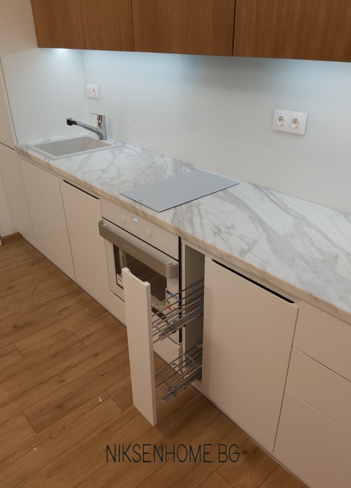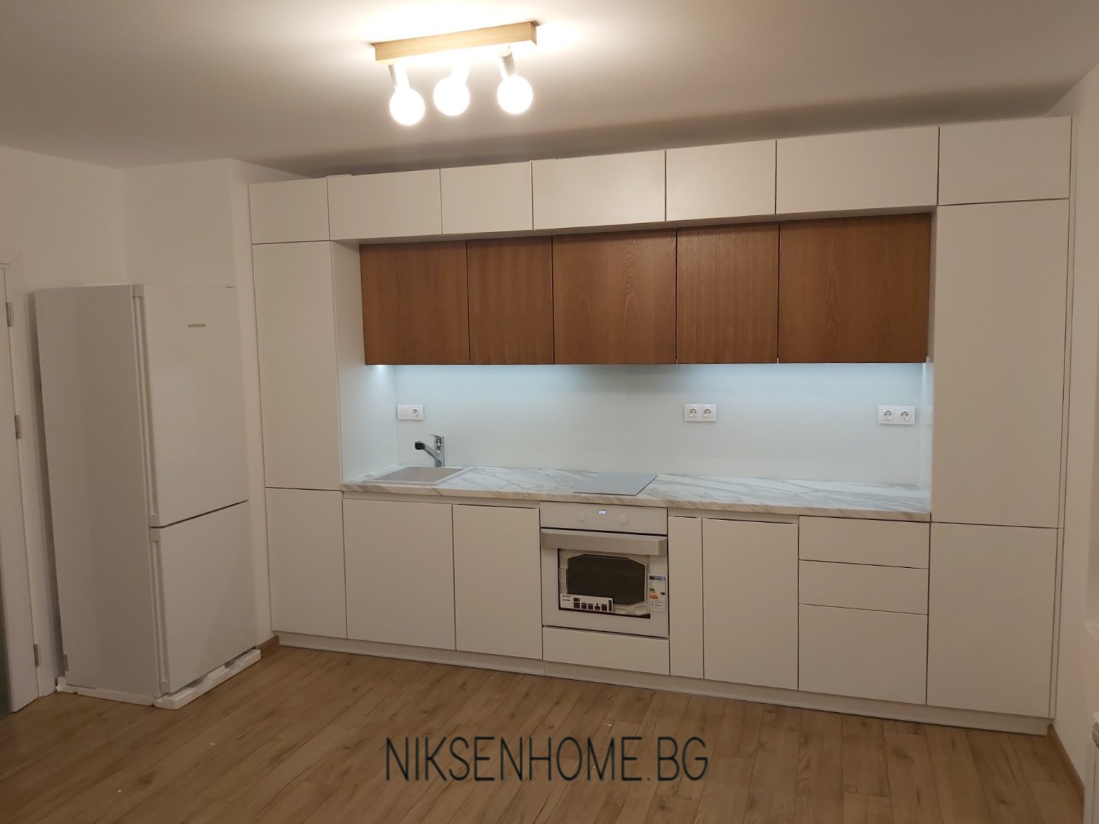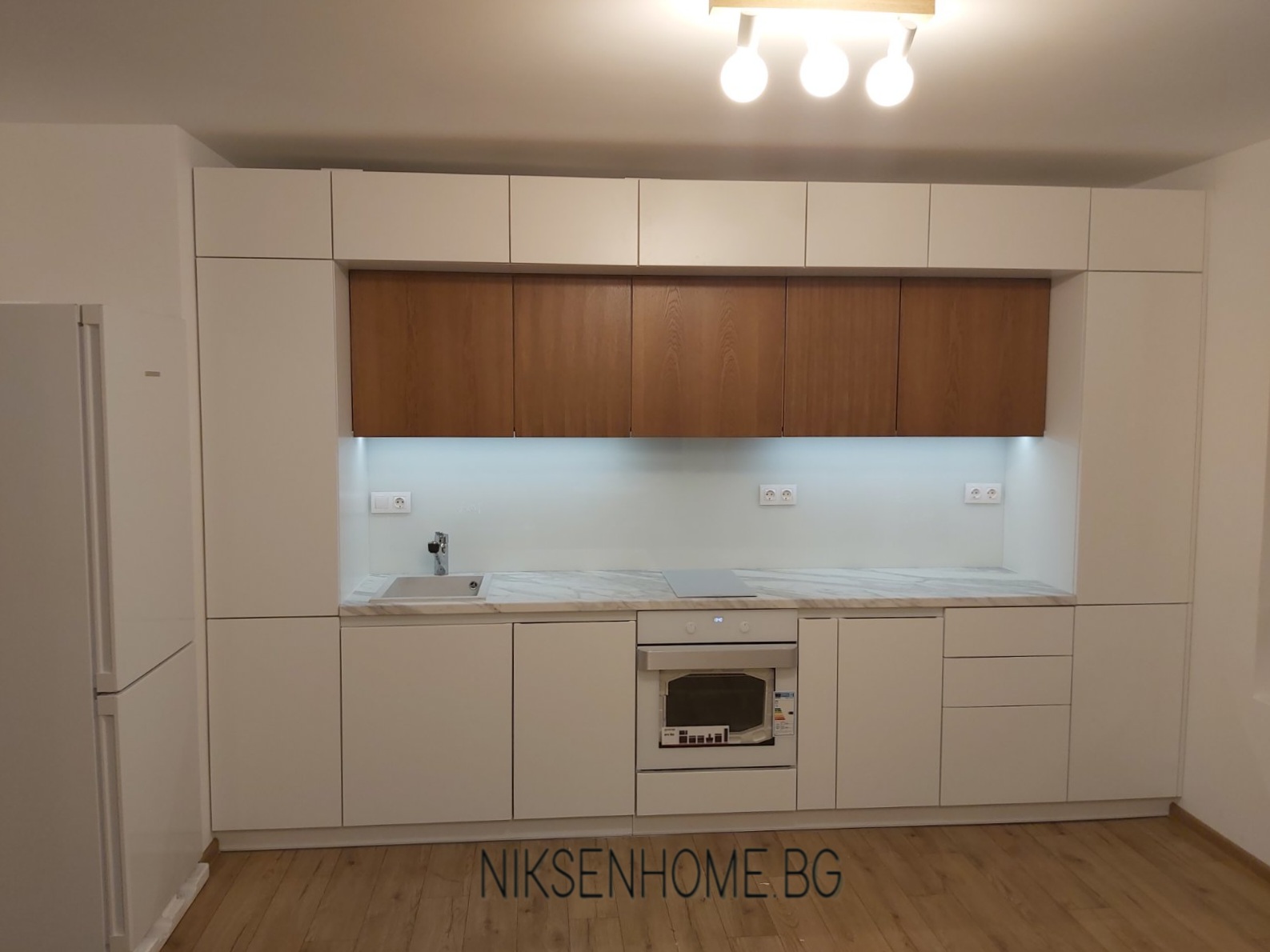 Модерна кухня със скрити дръжки, с основен цвят бялото, което се появява в няколко материала. Вратите са МДФ с покритие от лак гланц с вътрешно вкопана дръжка и стъклен елемент. Гърба е бяло стъкло, а плота имитира мрамор. Стъкло керамичният плот, мивката и фурната също са бели. Топлината в тази кухня идва от естественият фурнир, които използвахме за горните шкафове и вкопаното лед осветление в дъното на горните шкафове.