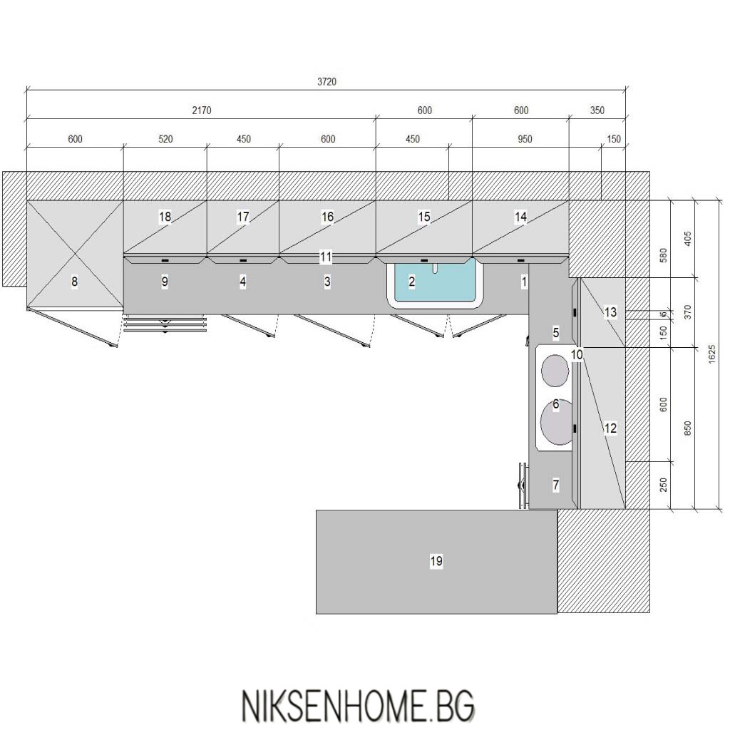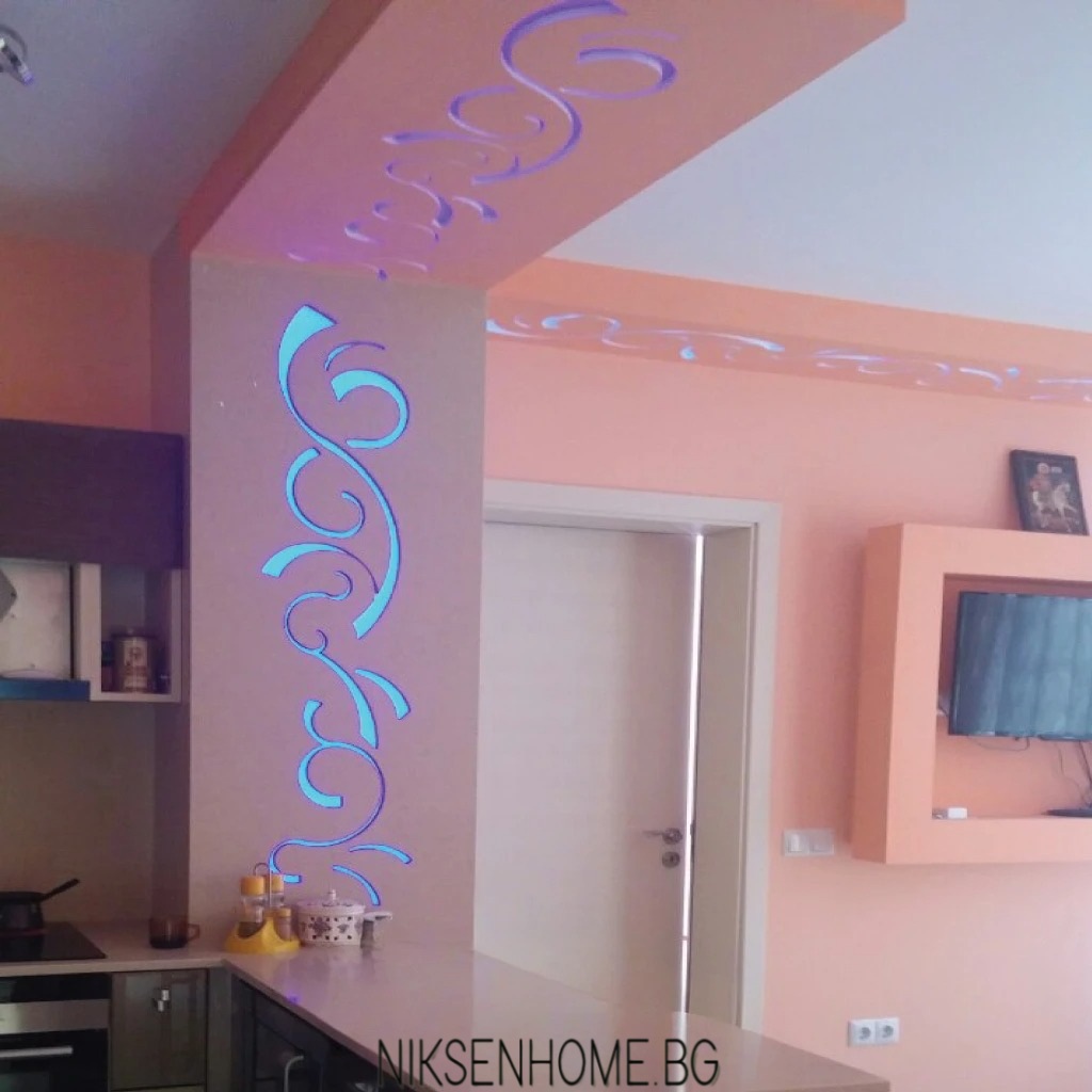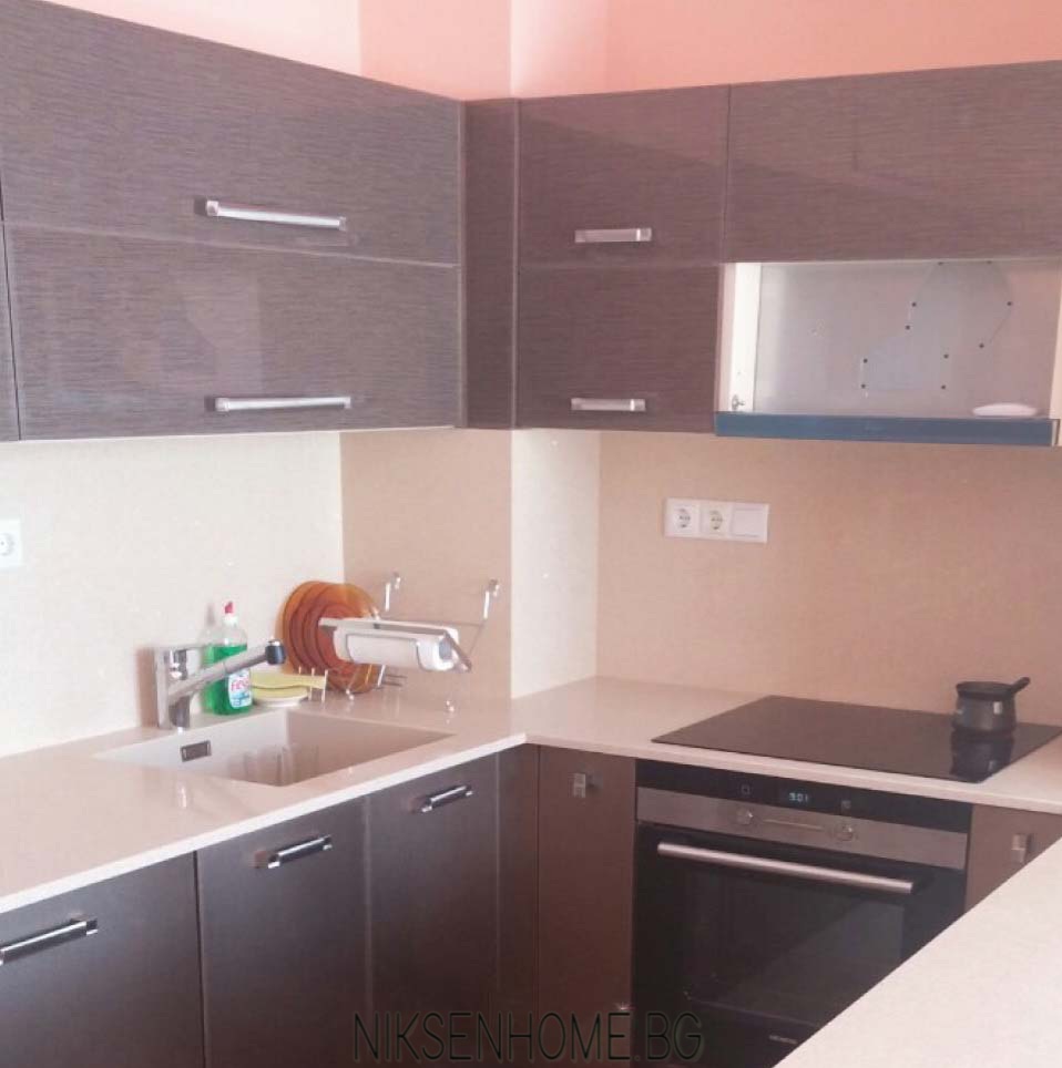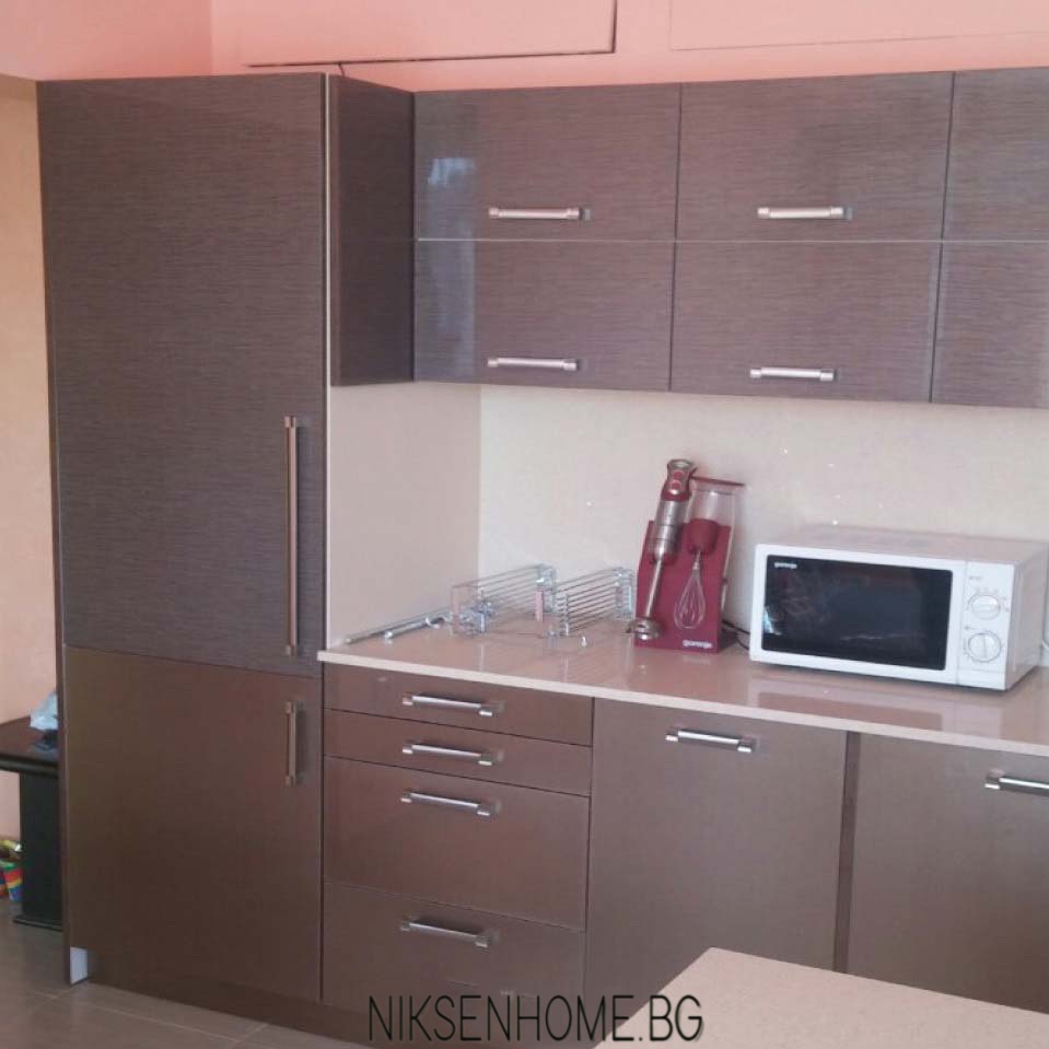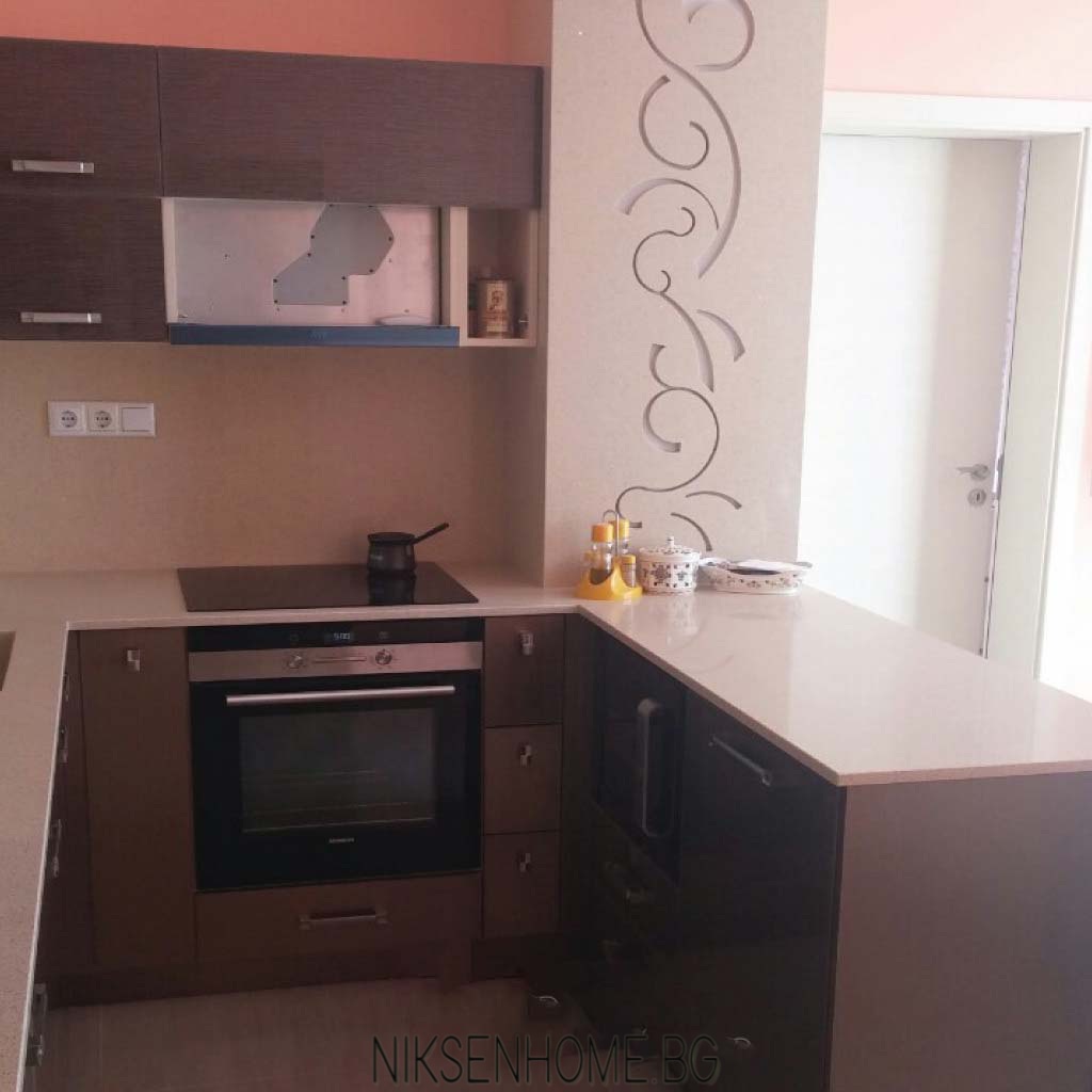 Невероятна комбинация на два цвята в кафявата гама, съчетана с плот от технически камък, с който е облечена и колоната. За да изпъкне кухнята видимите части на стените са боядисани в антично розово, а облицовките са с декоративни елементи и осветление за разкош. Вратичките са с гланцово покритие, което улеснява поддръжката и създава усещане за модерен стил, а дръжките, като бижу, изразяват визията още повече. Да пренесеш в кухнята място което не е само за готвене, а ти носи усмивка сутрин с кафето – ето това е шедьовър.