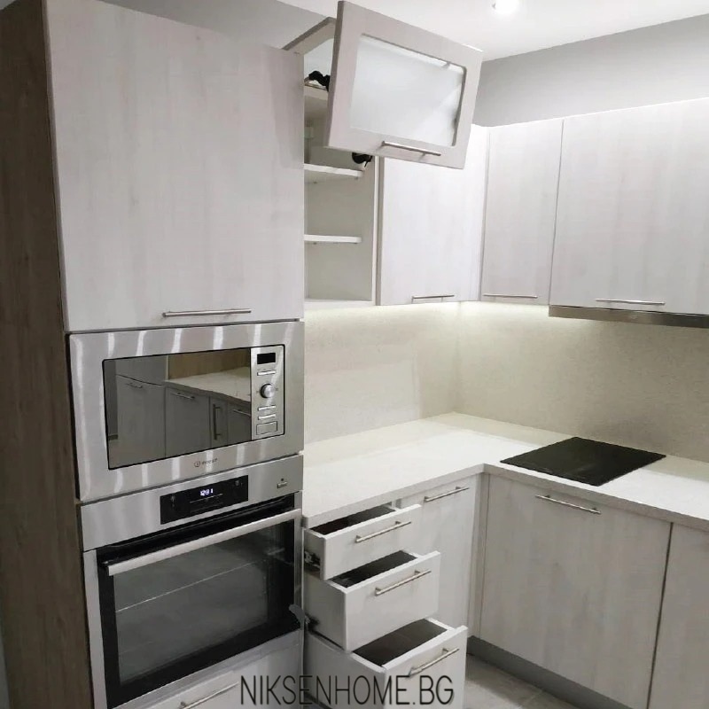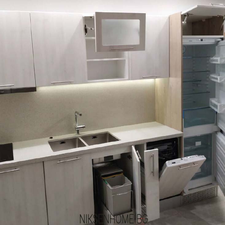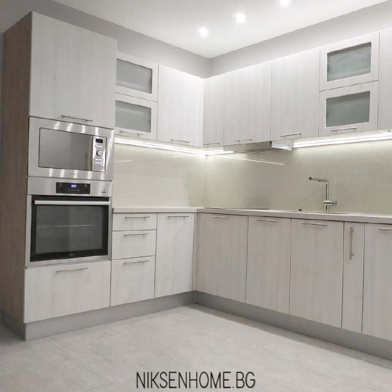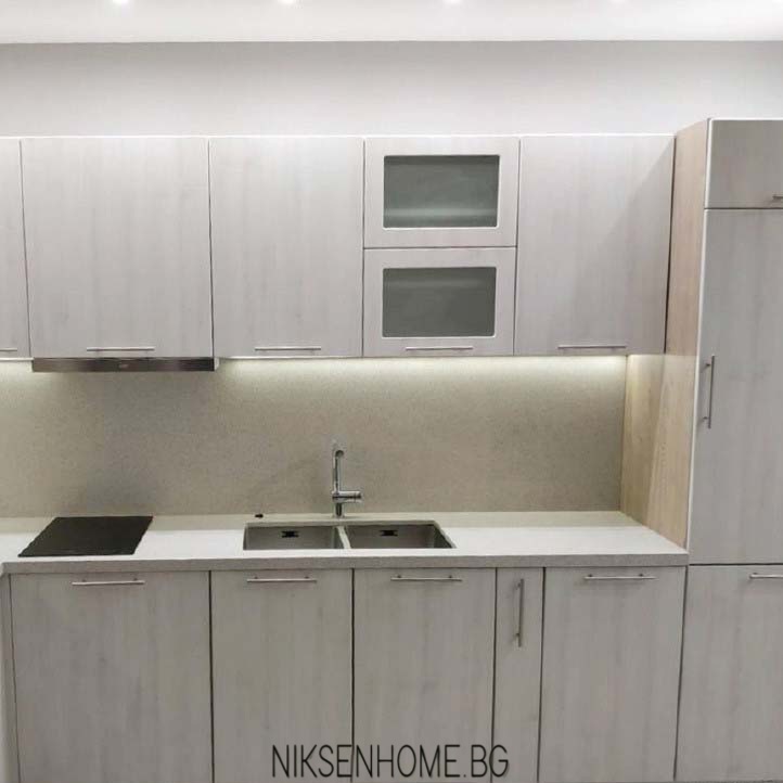 Модерната и изчистена визия е много предпочитана от нашите клиенти. Представяме Ви една от нашите последно реализирани кухни, изпълнена от МДФ вратички в студен дървесен декор и страници от ЛПДЧ в топло дървесно. За плот и гръб е използван технически камък в неутрален цвят, който обединява по стилен начин съчетанието между дървесните декори. За още малко лукс и разкош е разположено и ЛЕД осветление в топла светлина. На плота е поставена двойна мивка с долно вграждане, която създава допълнително усещане за лукс, но за да бъде и функционална кухнята освен луксозна са използвани и механизми като бутилиера, изтеглящ се кош за отпадъци. На гореният ред са разположени две витрини с клапващи механизми, които да отворят малко кухненското обзавеждане и да му предадат ефирност и завършеност.
