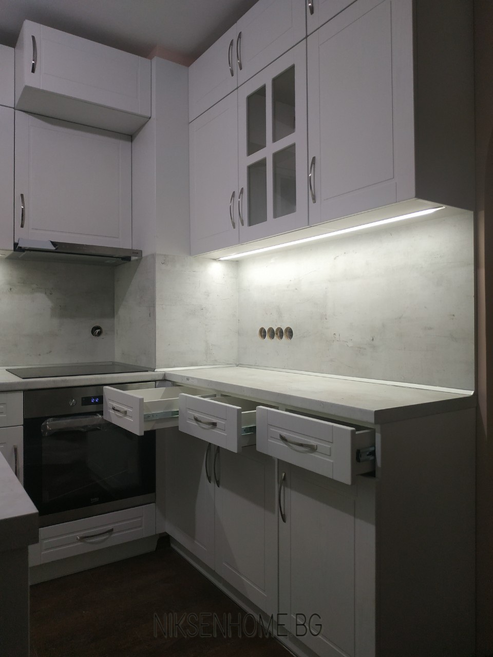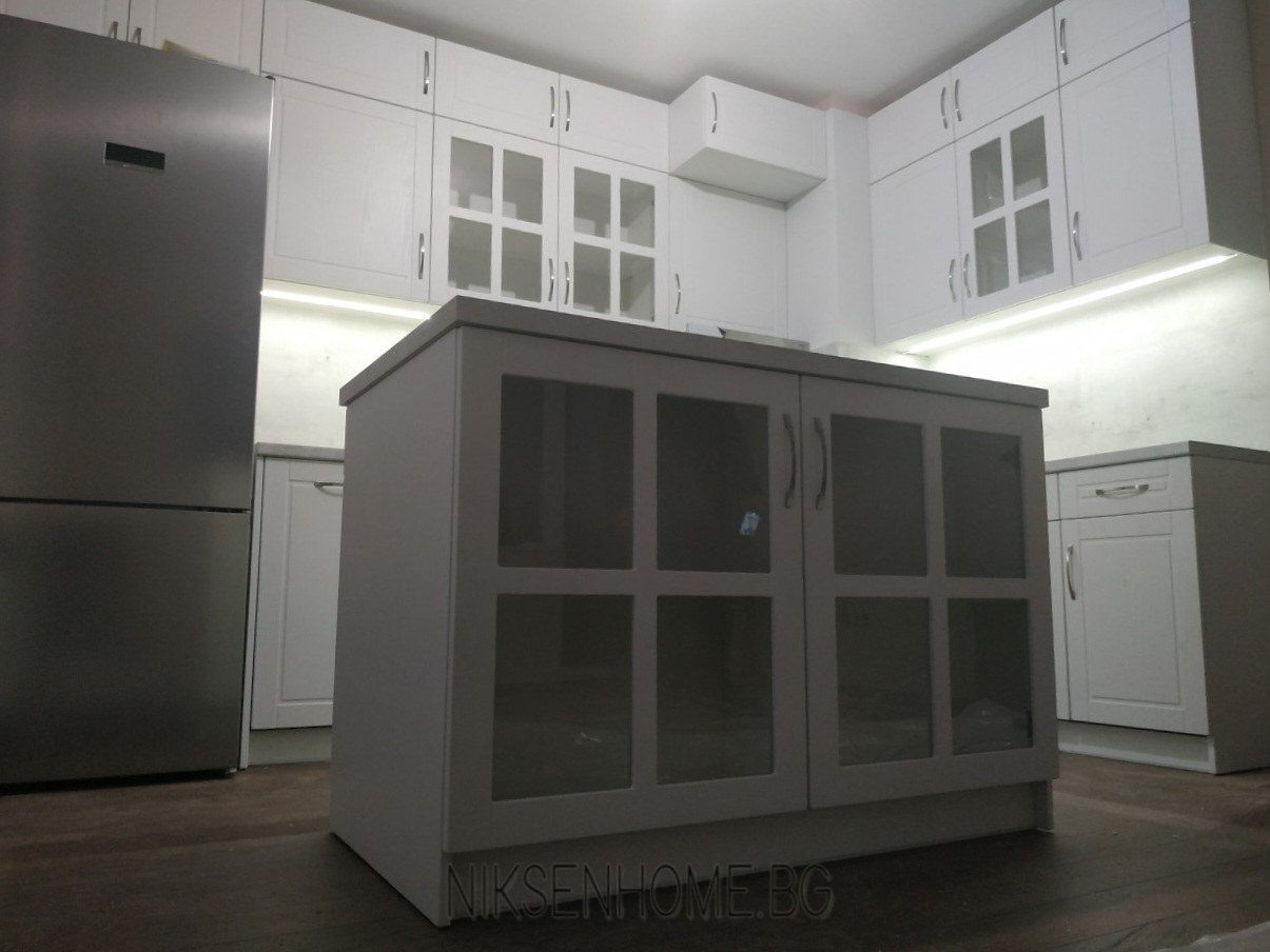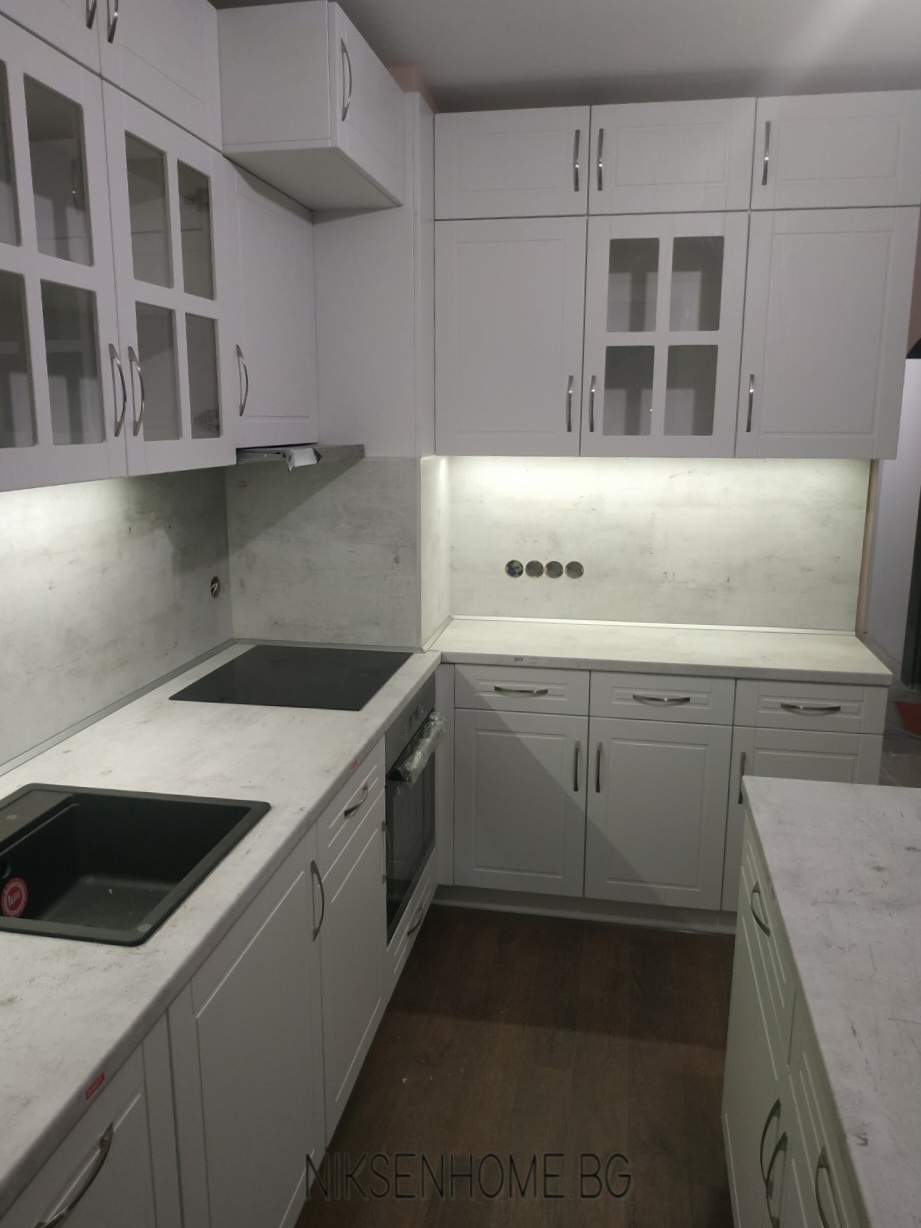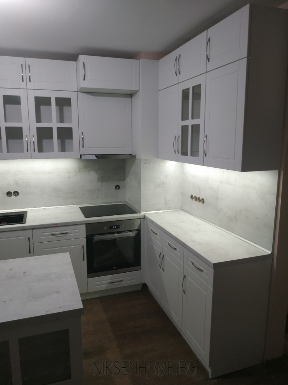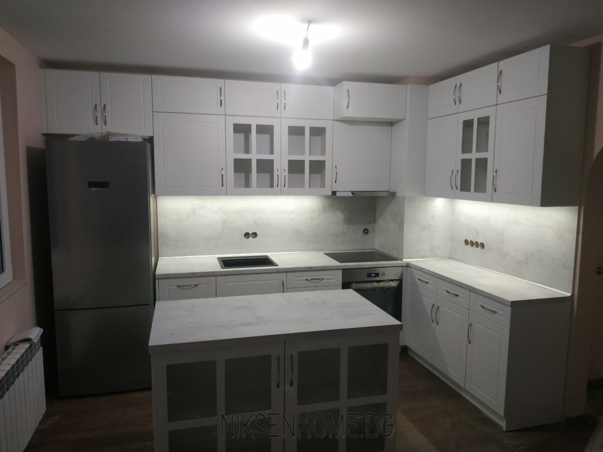 Вечната класика бял МДФ с подчертаваща елементите фрезовка, витрини и множество кътчета е съвременният ретростил. Бялата изчистена линия предразполага за кулинарно развихряне. Всяка една ниша, чекмедже, разположение на уред или витрина са предварително замислени и така изчислени, че да е удобно, бързо и лесно приготвянето на храна за домакинството. Поставянето на остров в центъра допълнително улеснява използването на кухнята от четирима и повече човека.