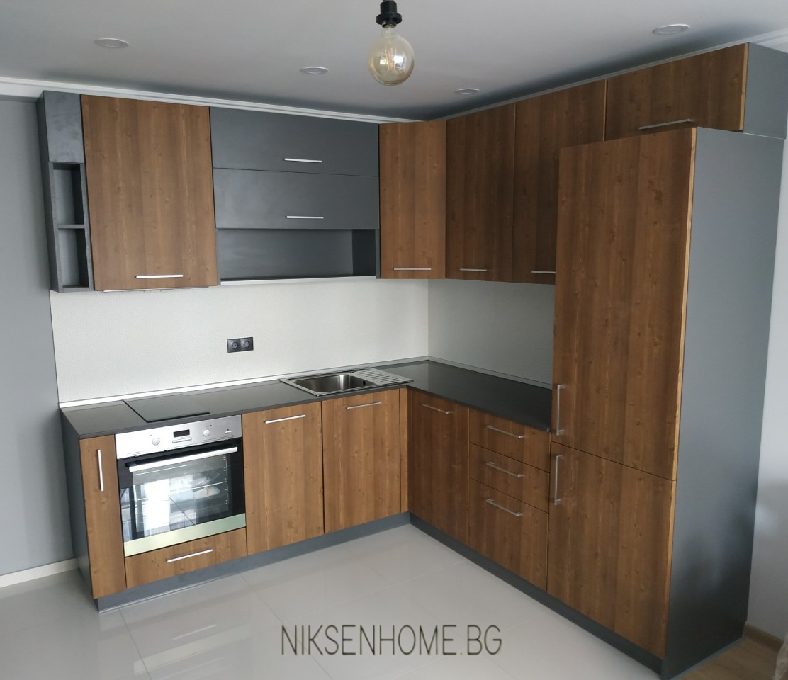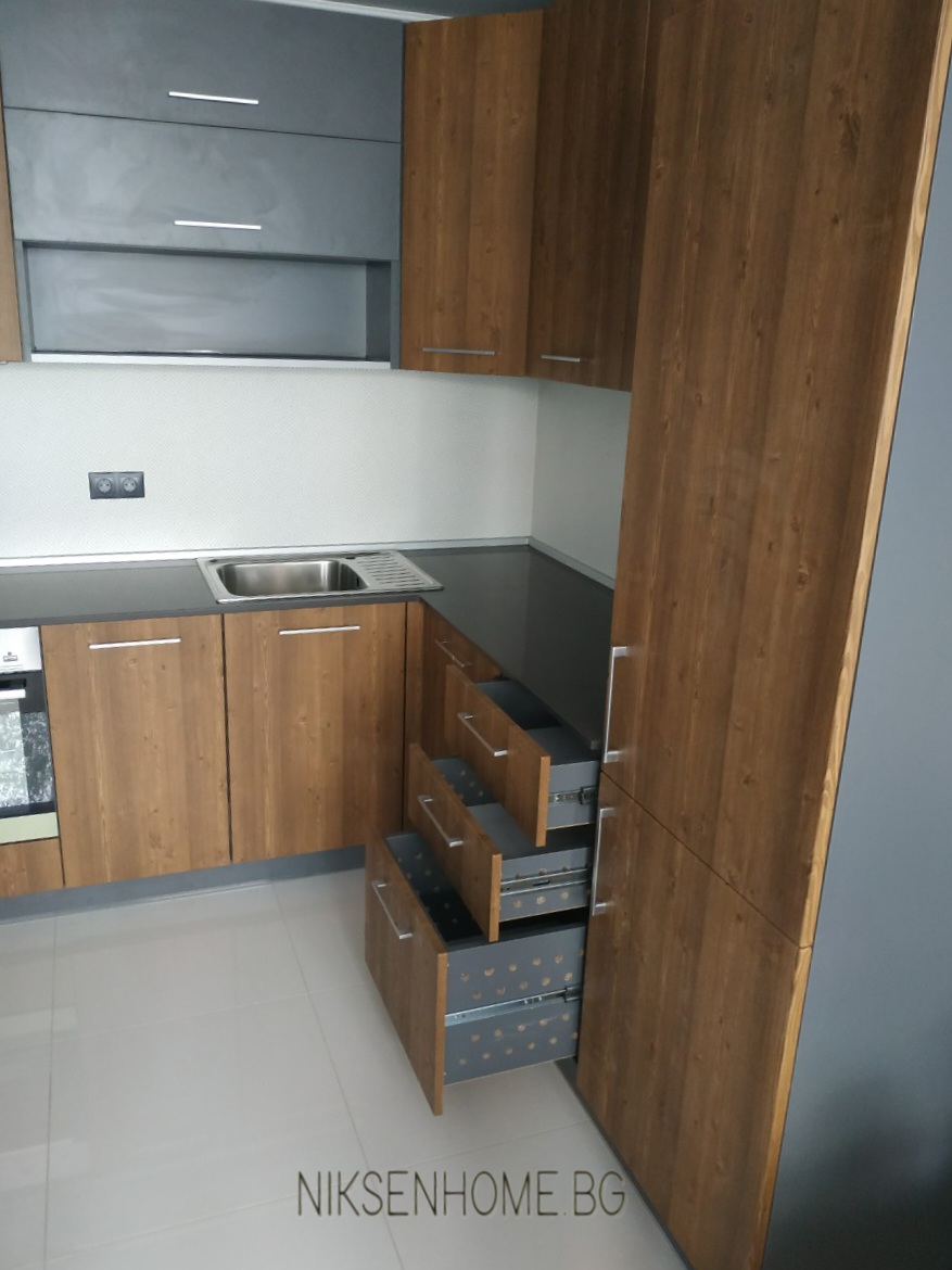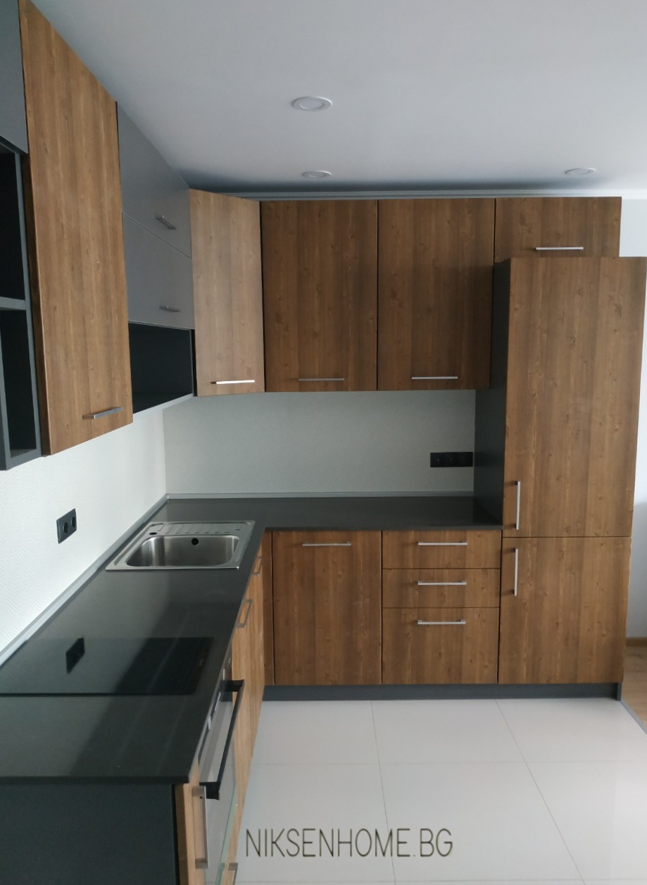 В този проект преобладаващият дървесен декор на вратите е комбиниран успешно с корпус и елементи в графит. Плота от технически камък и HPL гръб с декор “Лабиринт” завършват умелата комбинация на материали и цветове. Нека името Лабиринт не ви подвежда, има изход от тази кухня, но трябва да намерите вярната посока. Може би ще имате нужда от малко интуиция за да намерите вграденият хладилник,но след това наличието на свободен плот за работа до него и дребните допълнения като перфорирани чекмеджета за зеленчуци или пък шкафа за тигани, ще ви водят смело към котлона, мивката и „скритата” миялна, респективно там някъде е изхода.
