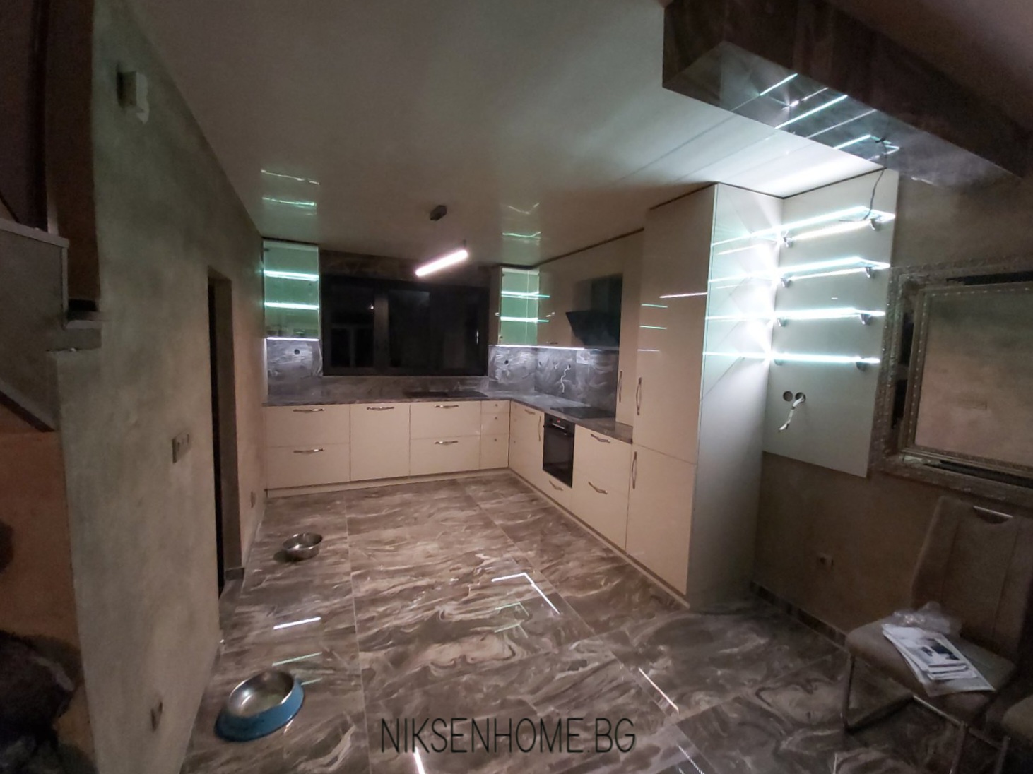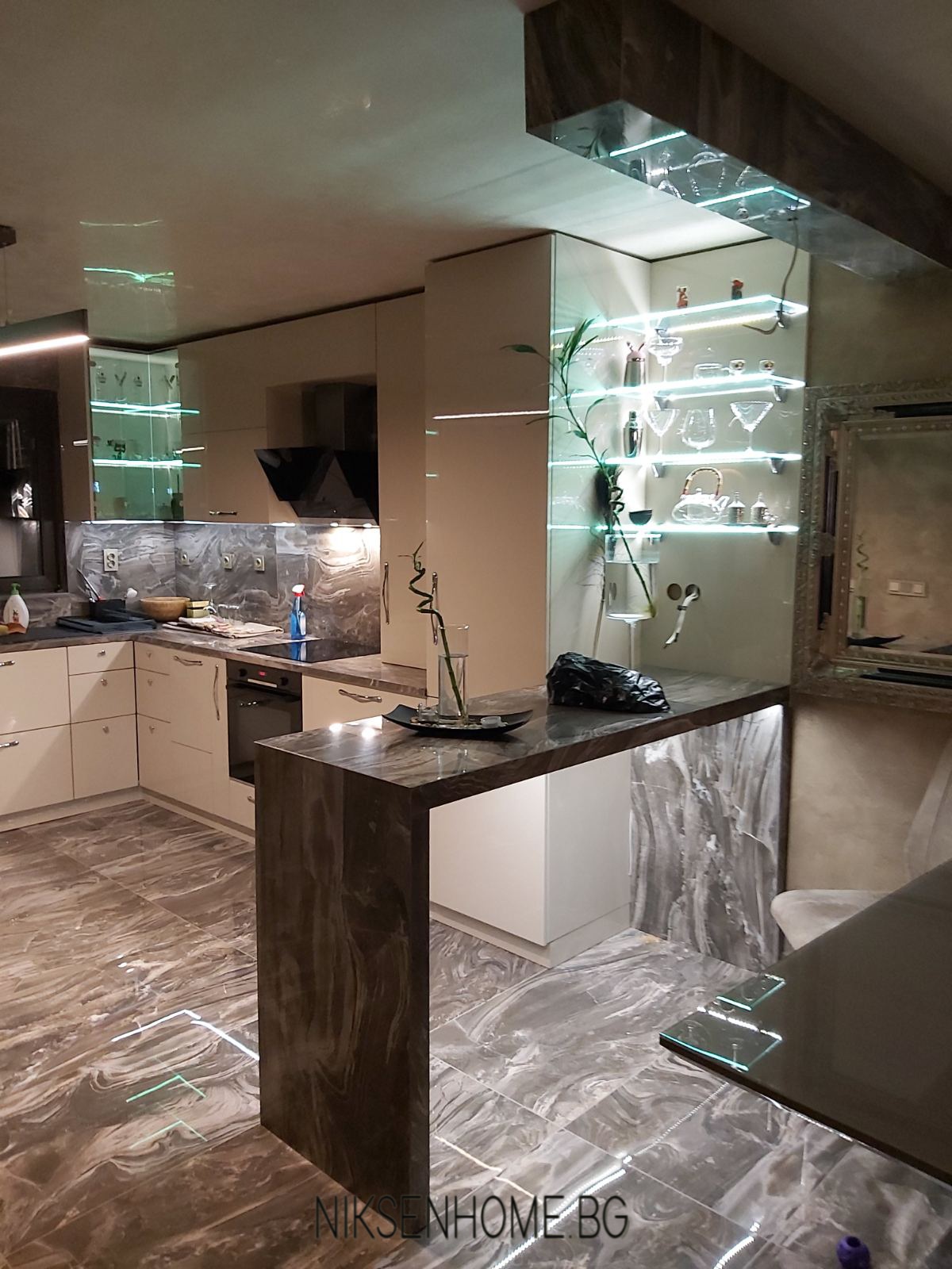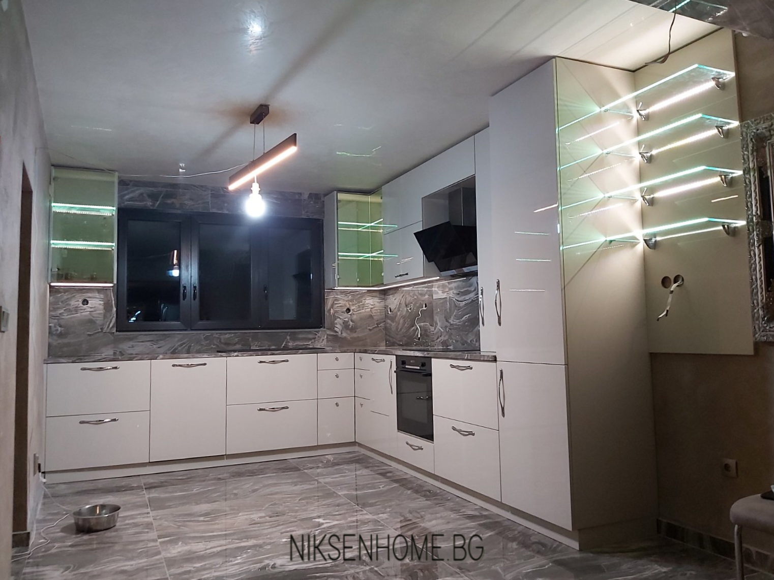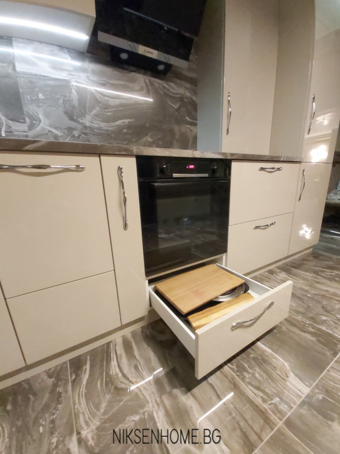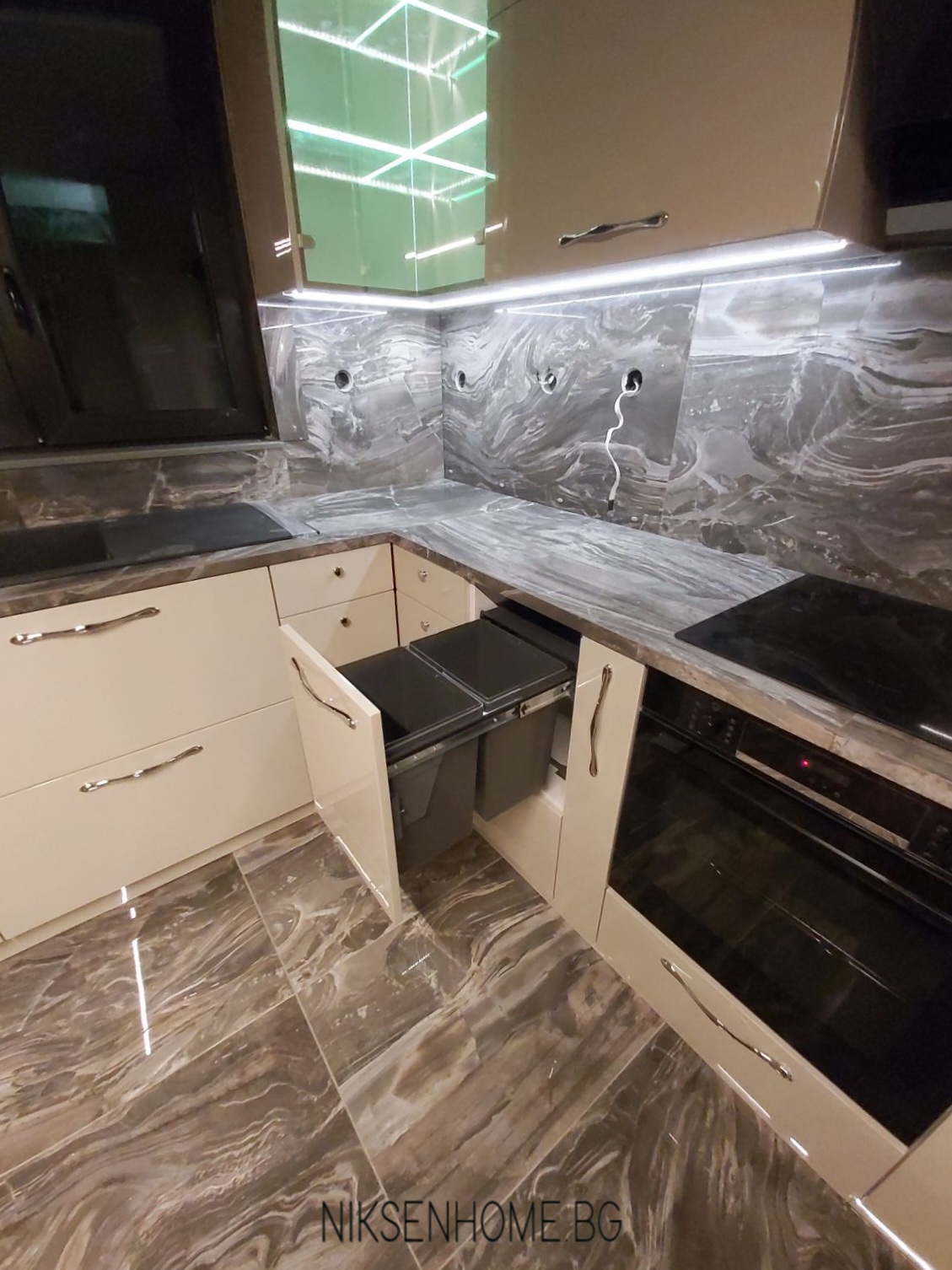 Лате макиато е модерна кухня с МДФ врати боя гланц, като цвета е направен по мостра и съобразен с плота и гърба, които вече бяха избрани от нашите клиенти. Така освен с размерите на помещението, прозореца , изводите за вода и аспиратор имахме още едно парче в пъзела. В долният ред преобладават чекмеджетата, като най-впечатляващи са ъгловите. Кошчето за боклук поместихме в отделен шкаф, а под него обособихме място за купите на кучето. Многото лед осветление и stopsol стъклото без рамка допринасят за луксозната визия на кухнята.