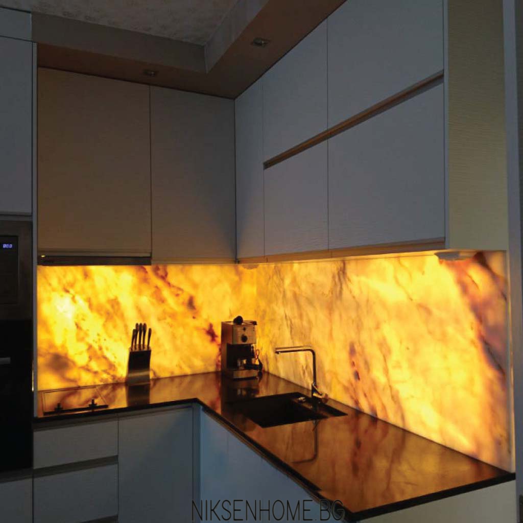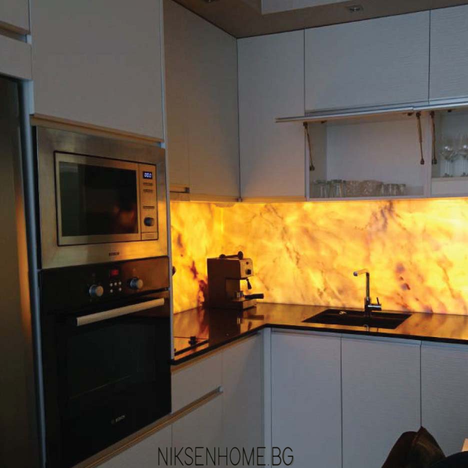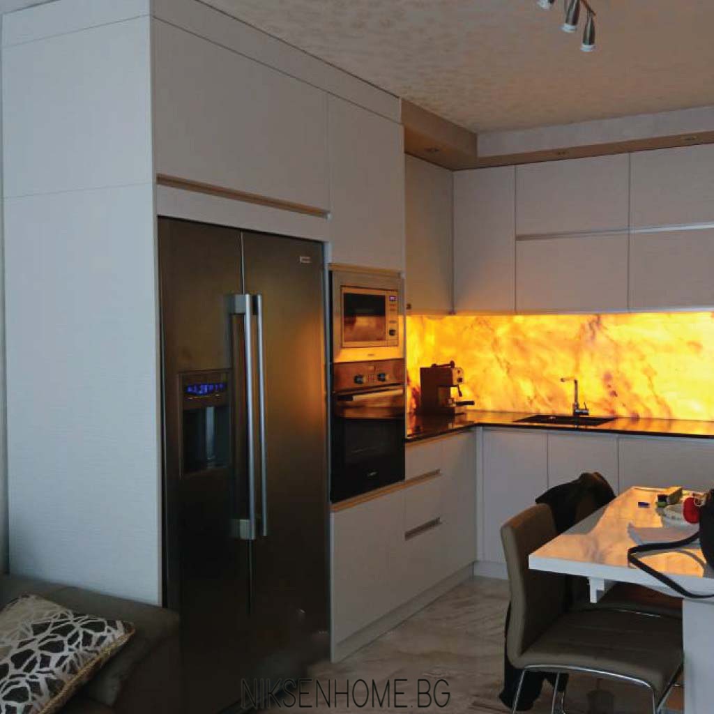 Елегантно съчетание на бели релефни МДФ врати с технически камък за плот и естествен за гръб с вградено осветление. Кант дръжката поддържа правите линии и подчертава стилната композиция. Функционално и красиво – кухня с такова съчетание няма как да остане незабелязана. Антрето в цвят капучино, съчетано с бяло ви приветства с мекото си излъчване да влезете в дома си, а едновременно с това е съчетано с всички околни цветове. Прииска ли ви се да озарите дома си и Вие?