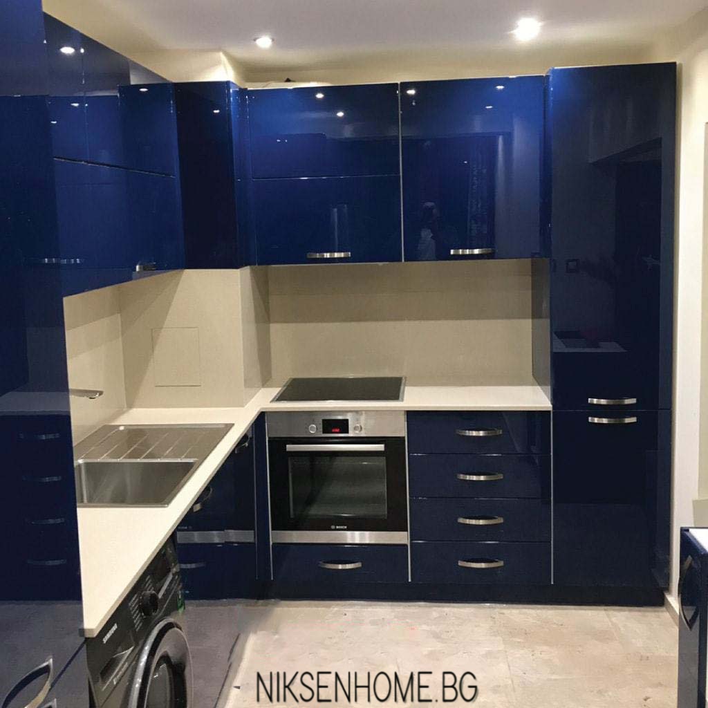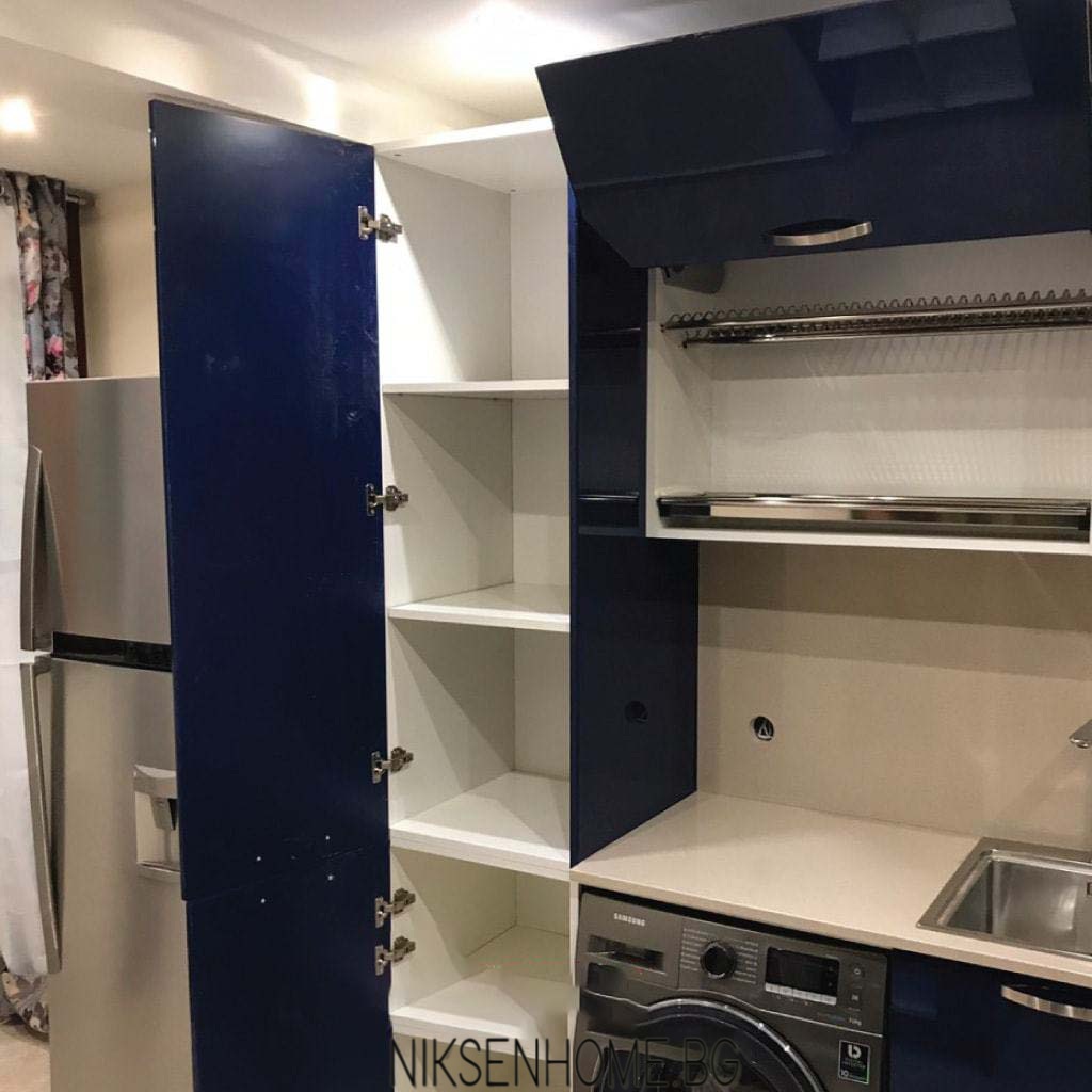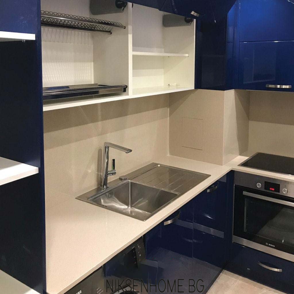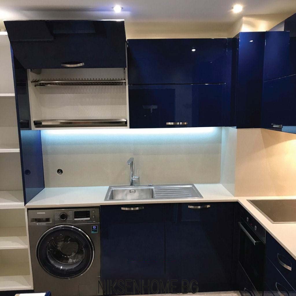 Прелестна, лятна, цветна, удобна и най-вече практична кухня в сини тонове от МДФ боя гланц – истинско въплъщение на модерната кухня! Плотът и гърбът от технически камък в бежово отварят композицията и се осветяват от вграденото осветление. Кухнята е завършена с остров за постигане на повече работна площ и място за съхранение и изпълнена с удобни механизми, улесняващи домакинята.