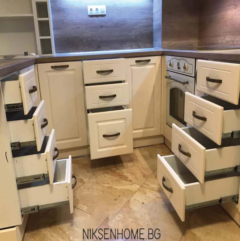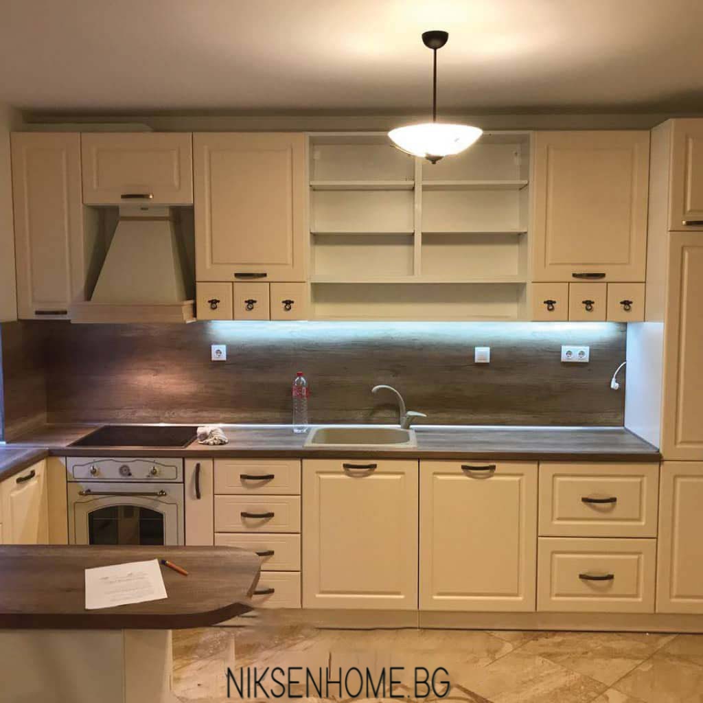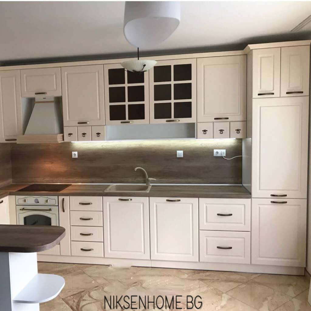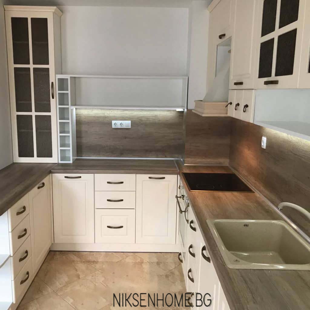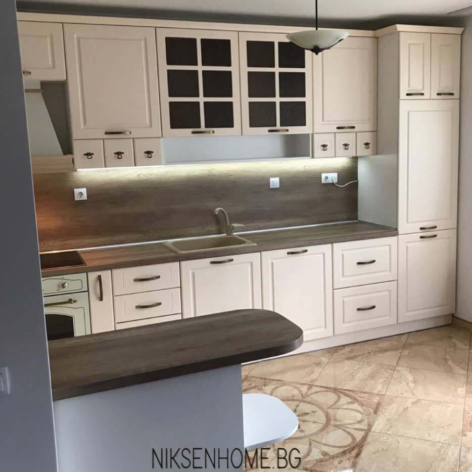 Страхотна раздвижена визия с малки чекмеджета в горният ред за разкош и доста на брой в долния, за да е максимално удобно. Откритите етажерки и рафтове придават игрива визия на класическите кухни и композицията става въздушна и лека. Плотът и гърбът са изпълнени в тъмна дървесна текстура, за да кореспондират с елементите на пода в помещението, а светлите фрезовани вратички от ЛМДФ освежават и отварят пейзажа. Витрините с декоративна решетка допринасят за ретро дизайна и предразполагат погледа. Финален щрих са дръжките, подбрани, за да подчертават и поддържат образа.