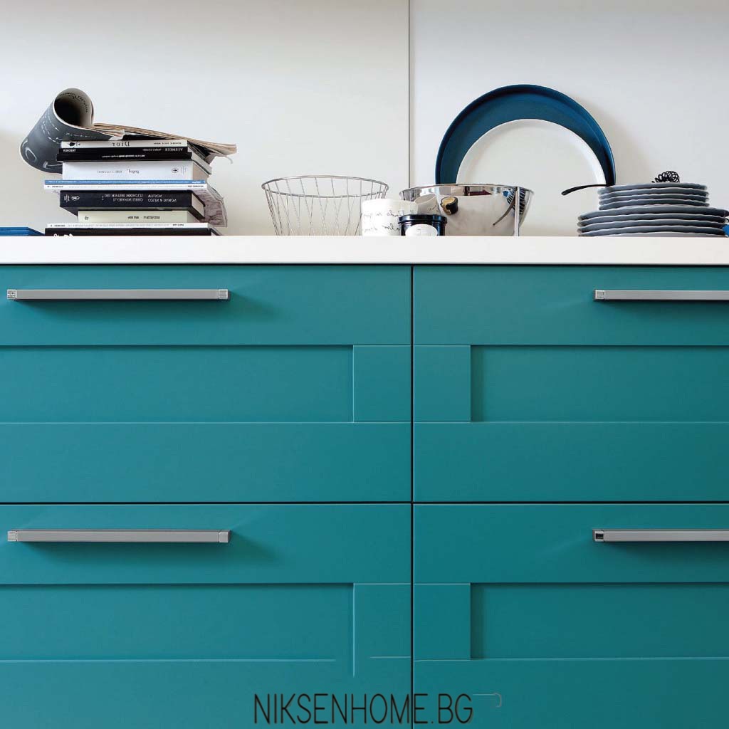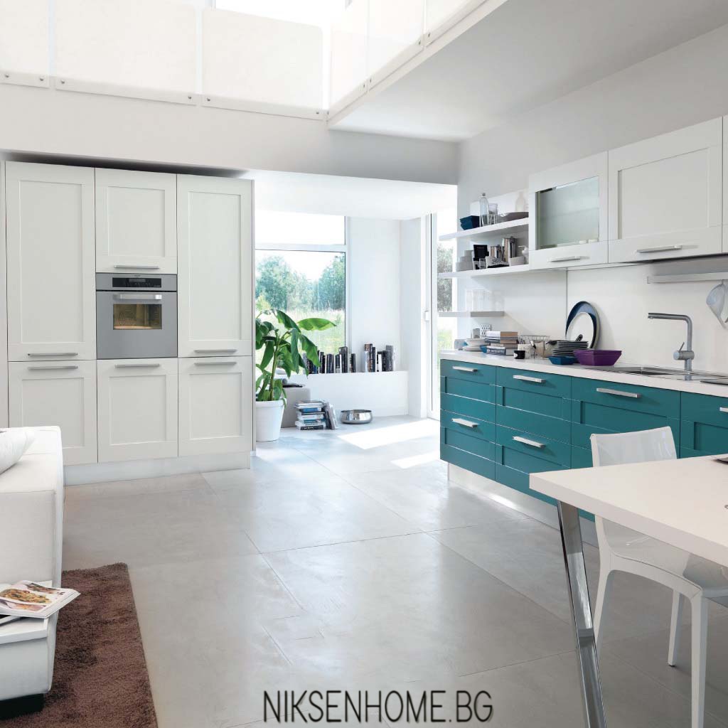 Смесване на ретро мотиви с новаторски решения стават все по-използвани в новите проекти за кухня. Защо да не съберем най-доброто от двете течения в едно? Подчертана симетрия с изчистени фрезовани врати, хоризонтално разположени модерни дръжки и просто, но влияещо цветово решение. Илюзия за по-голямо пространство, постигната чрез открити етажерки и ниско падащо бяло осветление. Е, не е ли това, което прави кухнята най-основен акцент в интериора?
