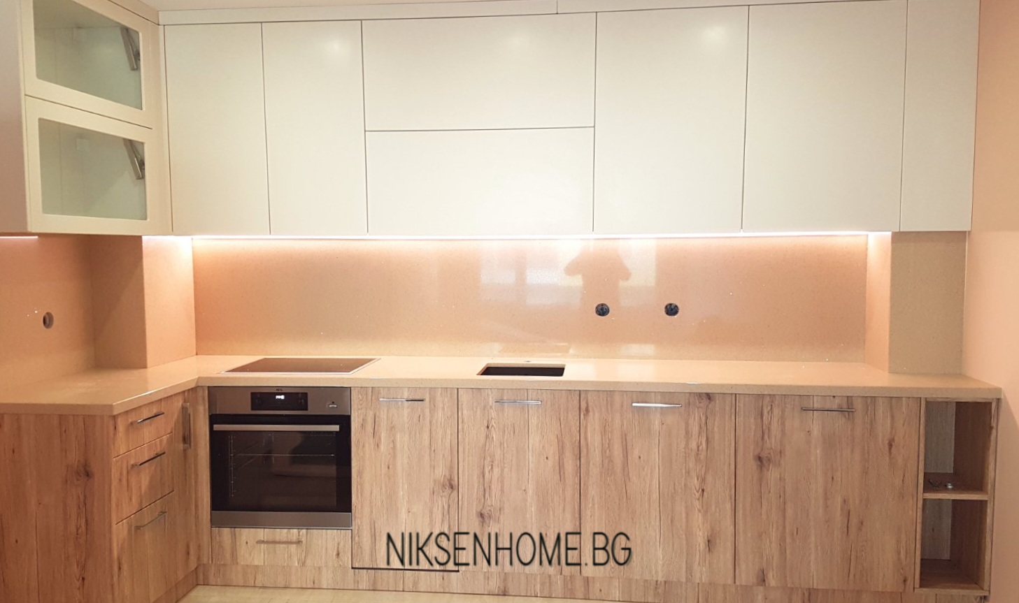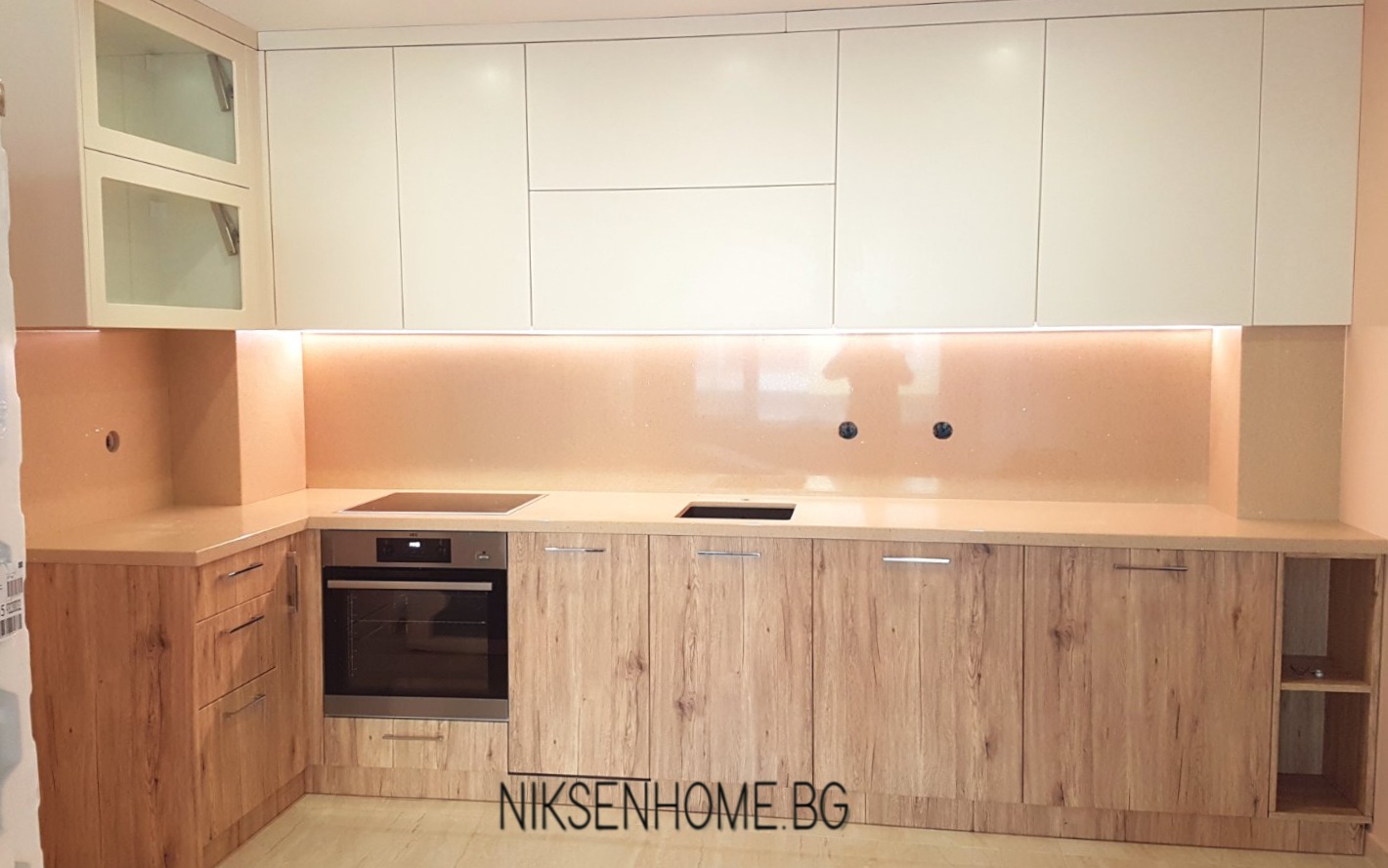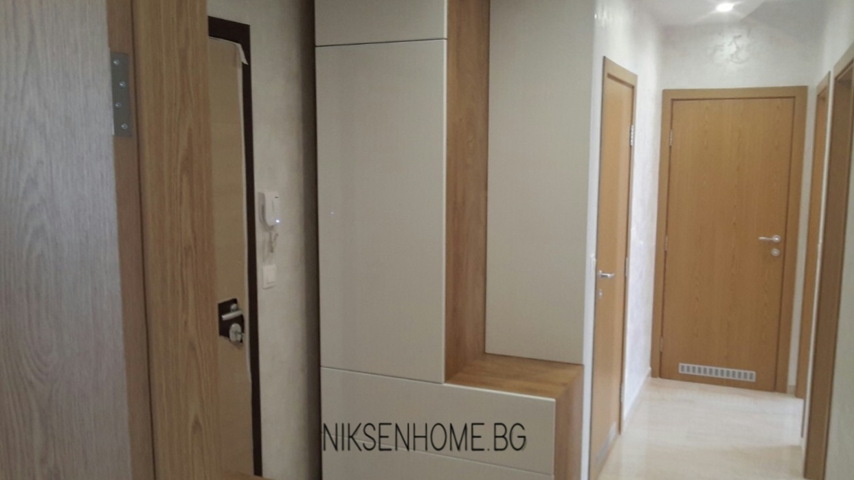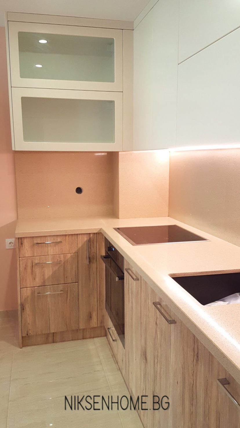 При създаването на модерна визия повечето клиенти залагат на гланцовите повърхности, но не е задължително да се ограничавате само с тях, при постигането на луксозна визия. В този проект сме избягали от стереотипа и сме използвали сатенени и матови повърхности, които създават усещане за топлина и уют. Интериора е изпълнен в умело съчетание от различни текстури като дървесина, технически камък, МДФ ламинат в кремав и бял цвят със сатенен финиш. Използвани са и хромирани елементи, които да предадат още една модерна нотка на цялостната визия.