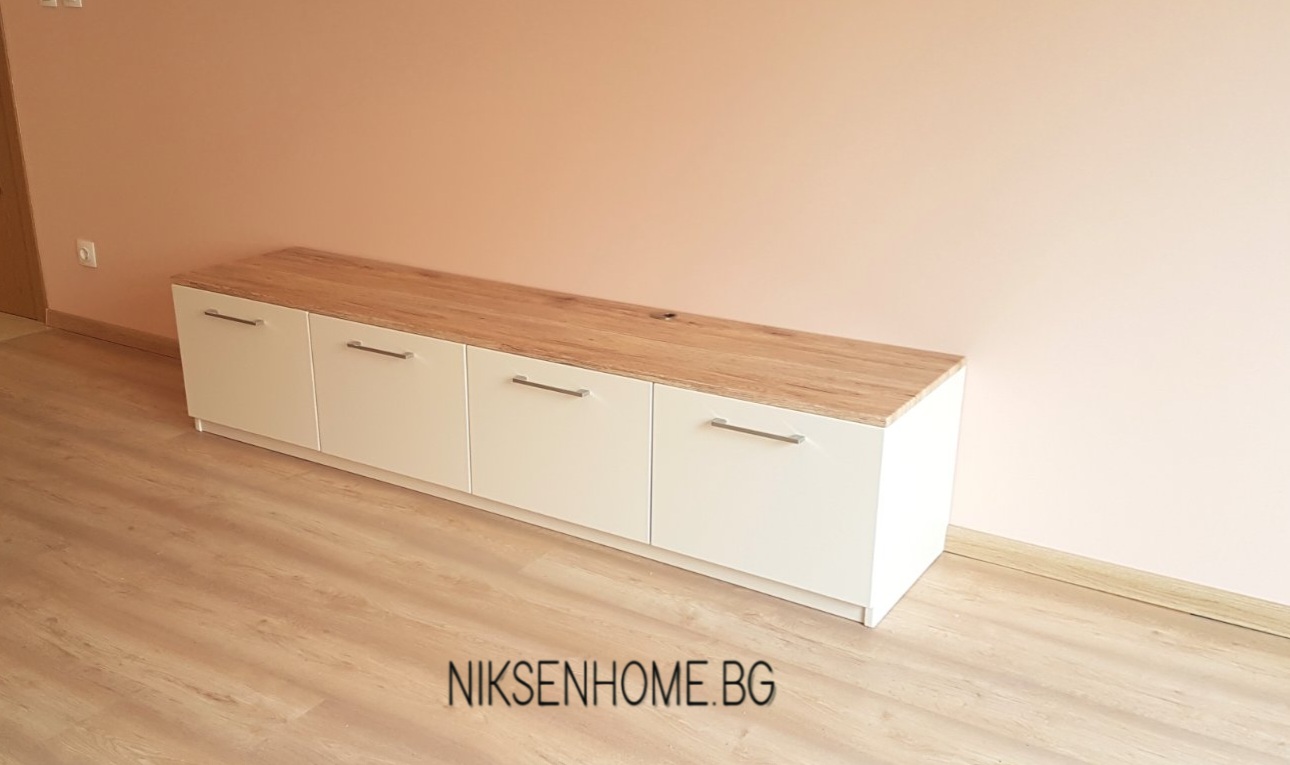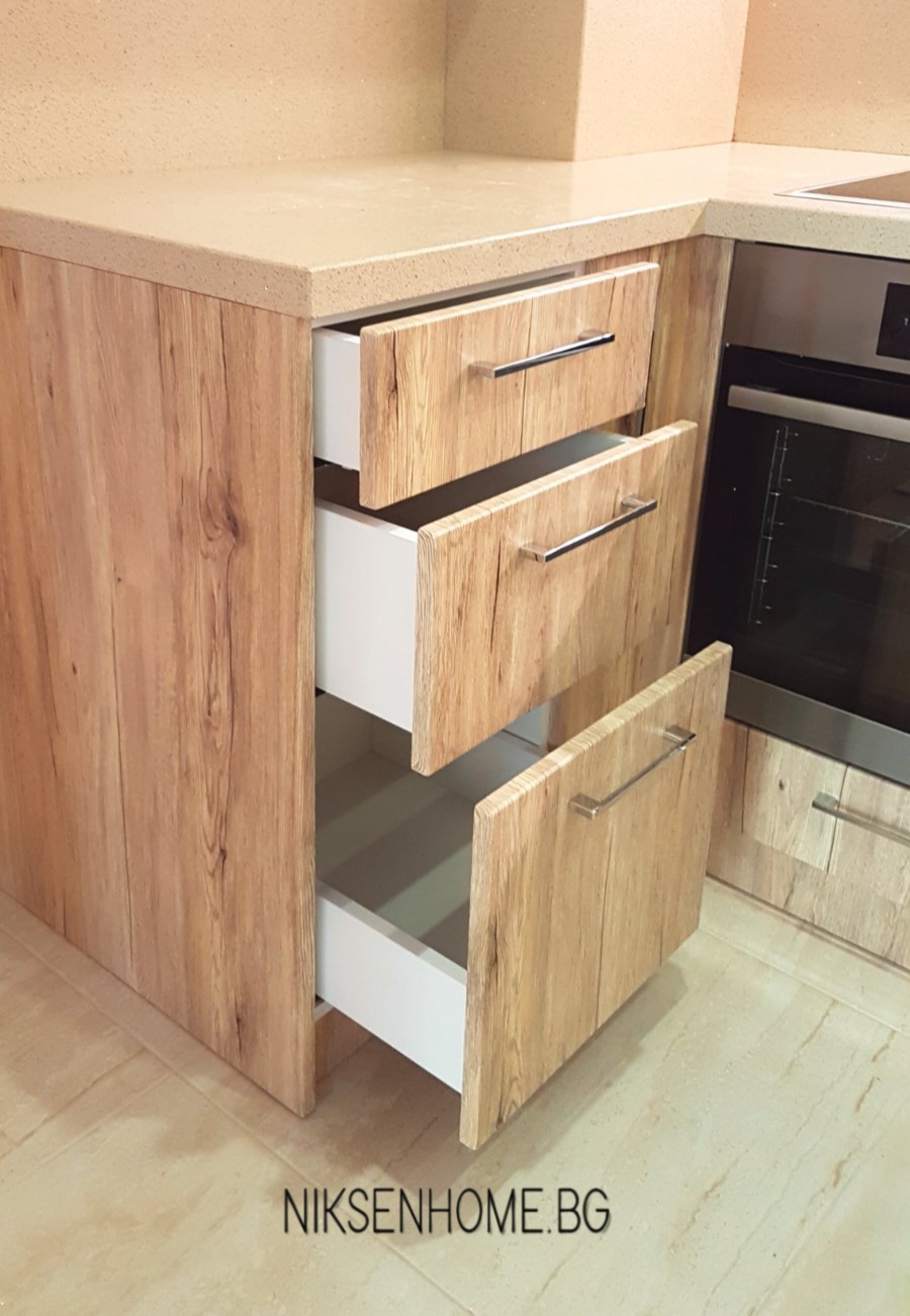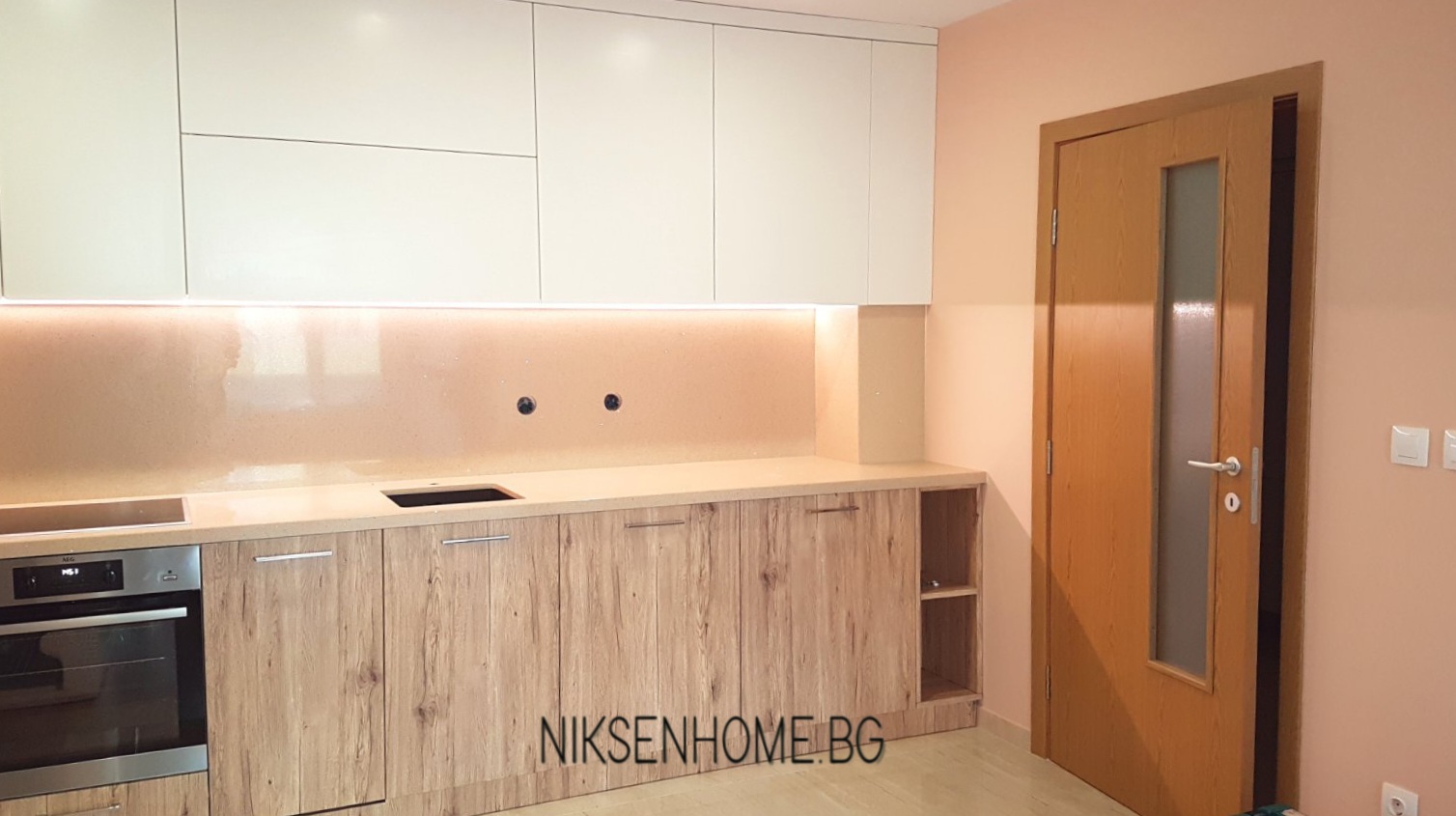 При създаването на модерна визия повечето клиенти залагат на гланцовите повърхности, но не е задължително да се ограничавате само с тях, при постигането на луксозна визия. В този проект сме избягали от стереотипа и сме използвали сатенени и матови повърхности, които създават усещане за топлина и уют. Интериора е изпълнен в умело съчетание от различни текстури като дървесина, технически камък, МДФ ламинат в кремав и бял цвят със сатенен финиш. Използвани са и хромирани елементи, които да предадат още една модерна нотка на цялостната визия.