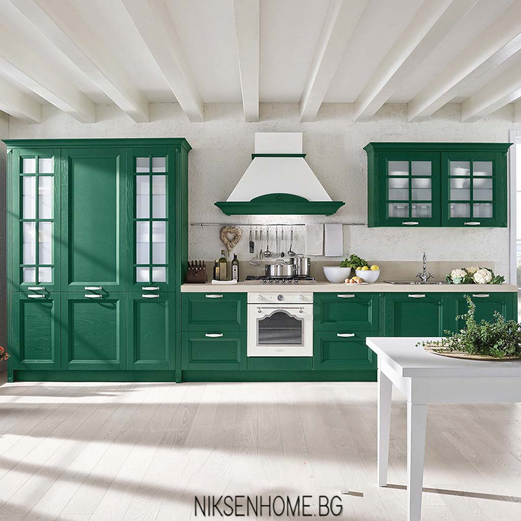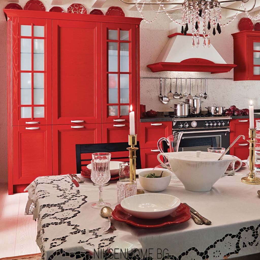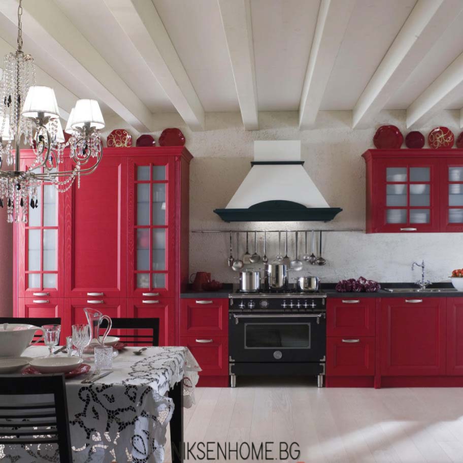 Вдъхновени от класиката в червено Ви представяме една кухня изработена с врати от МДФ боя в класическо червено и ретро форми. Изпълнението ярко изразява страстта от готвенето и заедно с акцента на черната фурна ни дава един различен поглед към кухненския дизайн. Колоните, решени с витрини, не отежняват композицията, а напротив – създават хармонична симетрия, центрирана според „огнището на дома“. Корниза и декоративните фризове играят роля за контур, а дръжките свързват цялата картина. Какво ще приготвите е само въпрос на въображение, когато имате такова бижу у дома.