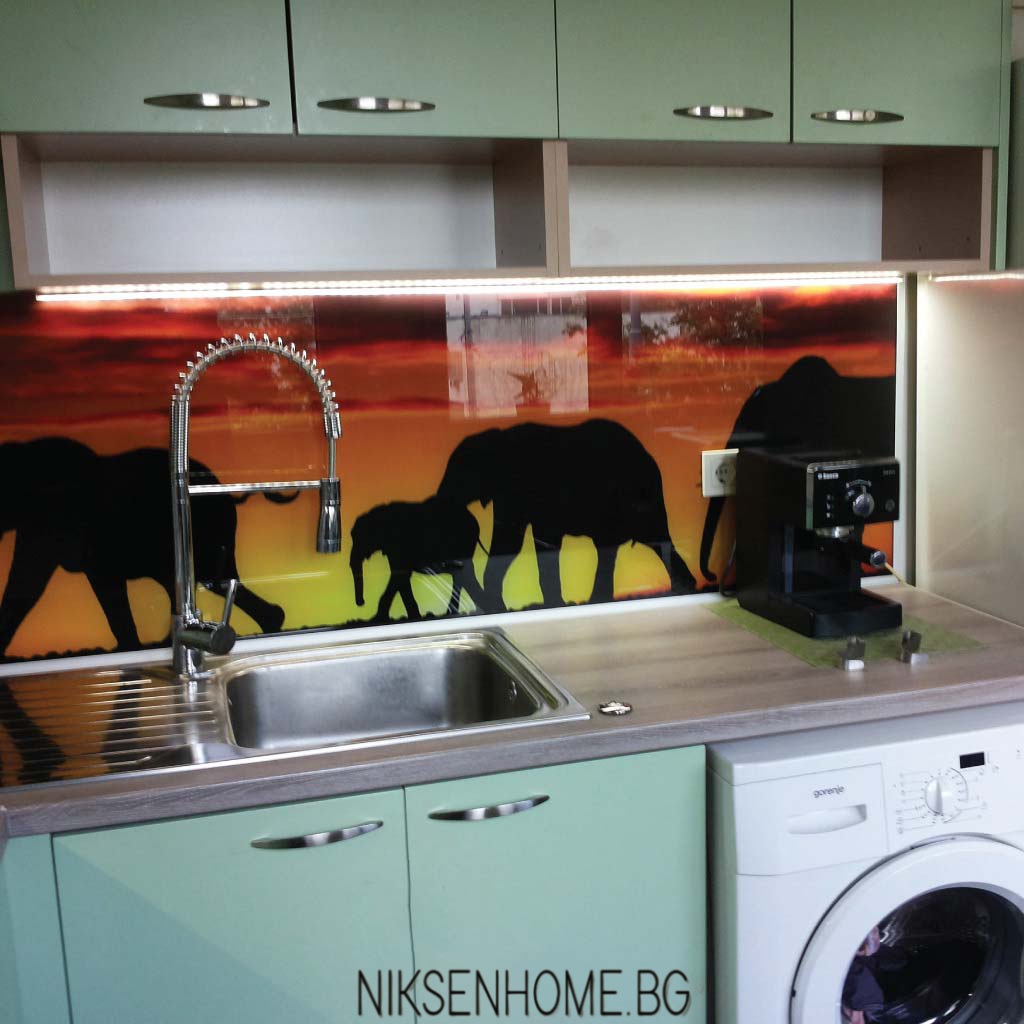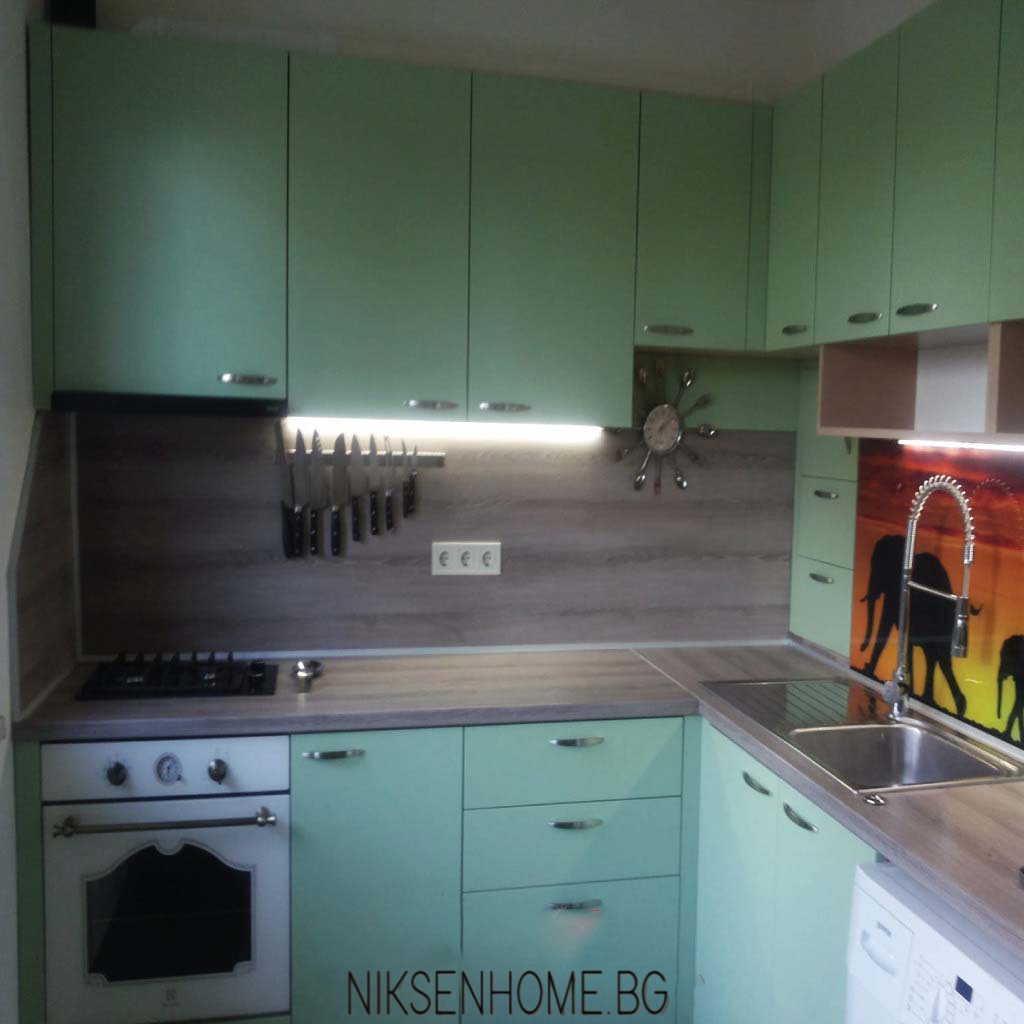 А защо да не пренесем прелестната обстановка на Африка и изгряващото слънце в домът си? Свежо съчетание на боядисани зелени вратички МДФ с дървесен елемент и принт стъкло, което би донесло усмивка сутрин, когато влезете в кухнята. И ето, в модерното жилище, разположено в градската джунгла се получава един спокоен оазис, който е не само функционален, а и предразполага за екзотични кулинарни подвизи.
