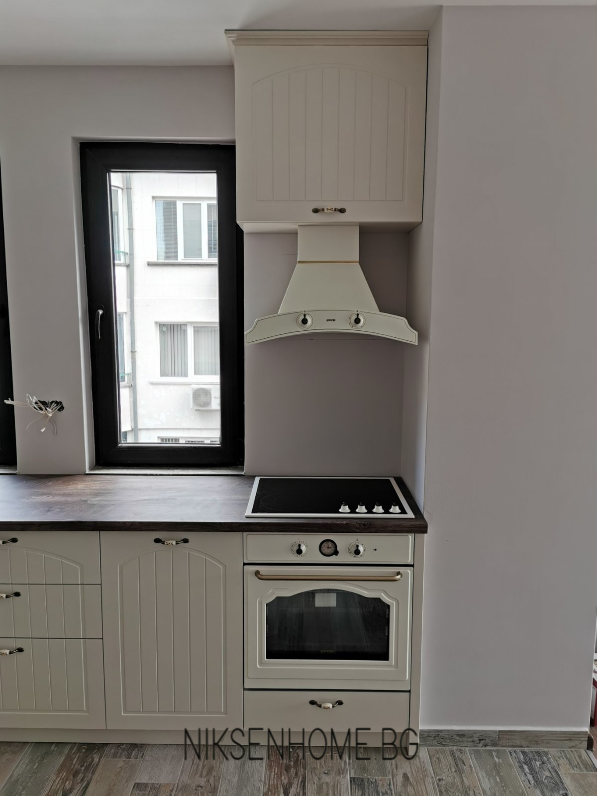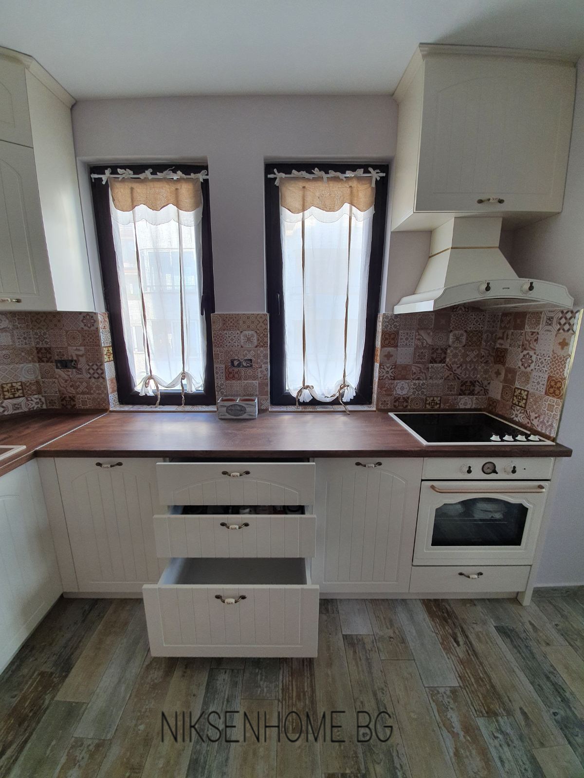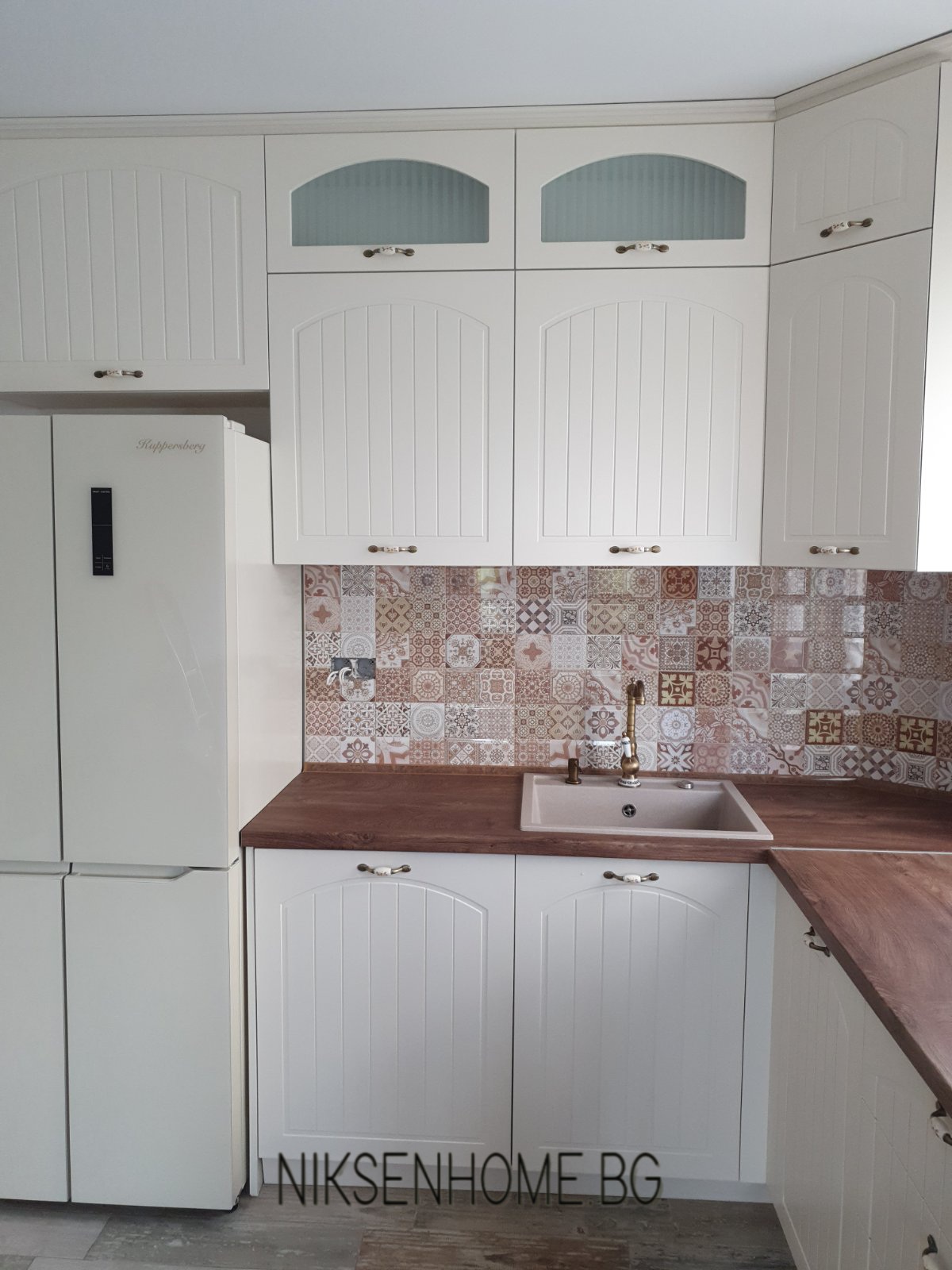 Ванилов коняк е кухня от приказките. Ретро стила започва от фрезовката на вратичката , преминава през електроуредите и стига чак до дръжките. Кухнята следва изцяло архитектурата на помещението, като за по-добра функционалност са дадени ясни граници на зоните за готвене. Ваниленият цвят на МДФ вратичките в комбинация с термплот Дъб коняк дават усещане за ефирност. Плочките и пердета са стилен избор от страна на собствениците, които няма как да отречем, че имат усет за детайлите.