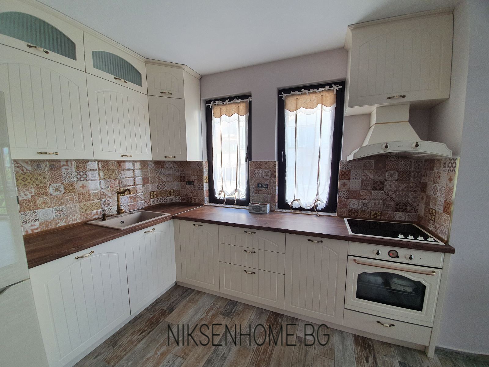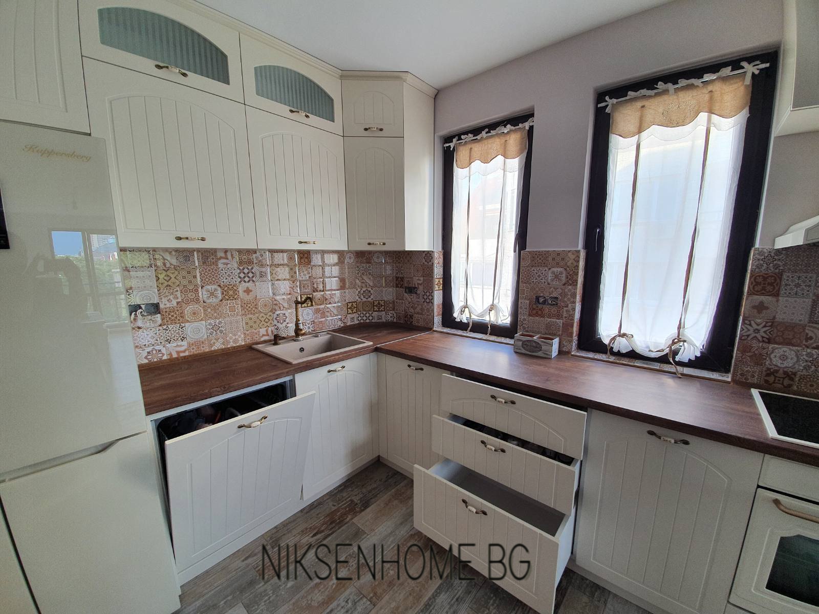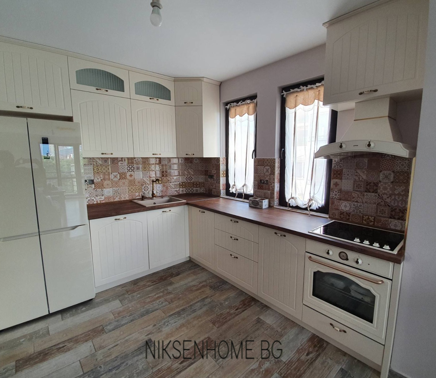 Ванилов коняк е кухня от приказките. Ретро стила започва от фрезовката на вратичката , преминава през електроуредите и стига чак до дръжките. Кухнята следва изцяло архитектурата на помещението, като за по-добра функционалност са дадени ясни граници на зоните за готвене. Ваниленият цвят на МДФ вратичките в комбинация с термплот Дъб коняк дават усещане за ефирност. Плочките и пердета са стилен избор от страна на собствениците, които няма как да отречем, че имат усет за детайлите.