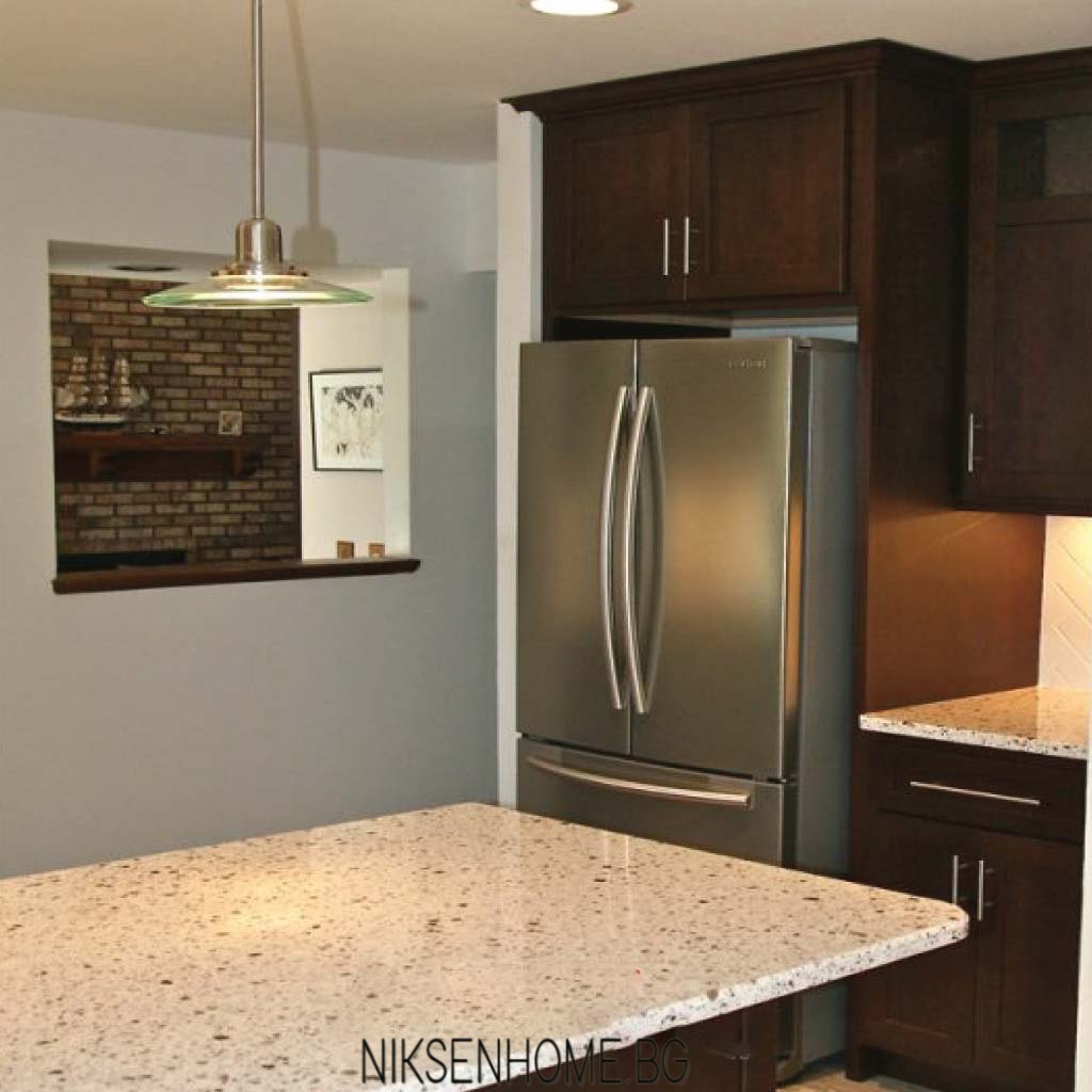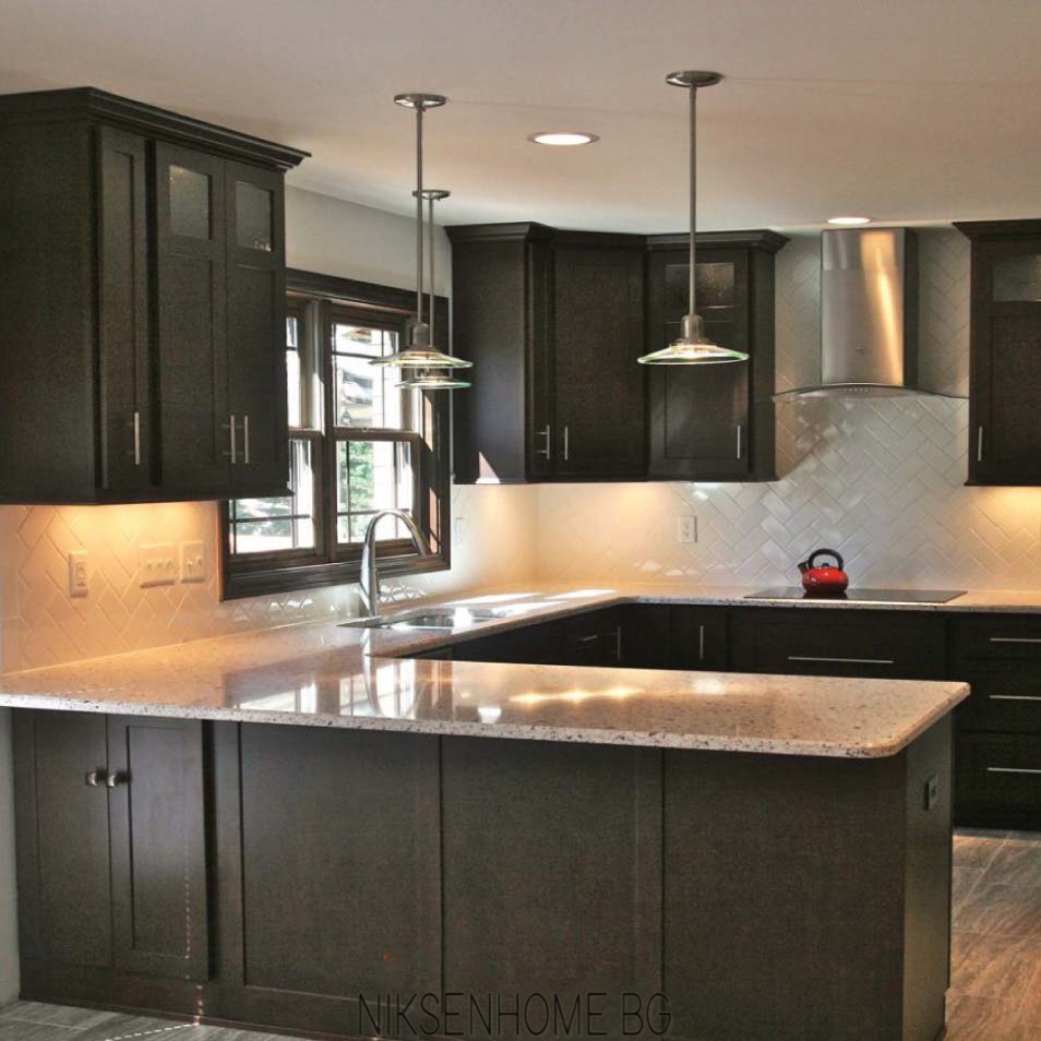 Поради това че в кухнята има прозорец и през целият ден навлиза слънчева светлина в помещението, е подбран тъмен цвят на обзавеждането. Дървесния цвят омекотява цялото помещение и пренася домакинството в нов различен свят.